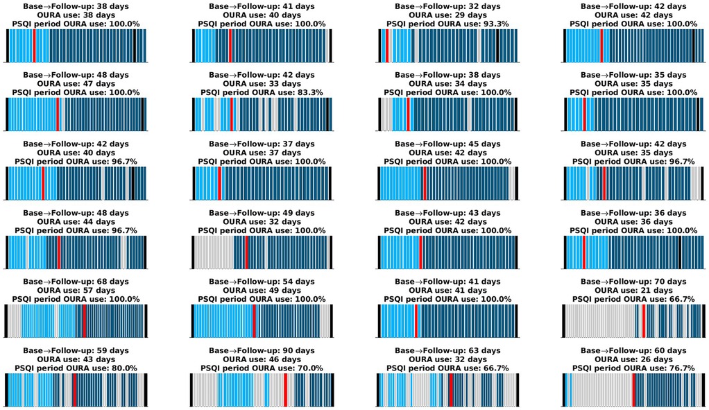 Figure 1. Oura ring usage for each participant. The x-axis spans the period from the time participants received the Oura ring until they returned it. Black lines indicate the baseline and follow-up visits. Light cyan bars represent days the Oura ring was worn during the baseline period, and dark cyan bars represent days during the intervention period. Gray bars indicate days the device was not worn. The red bar marks the start of the one-month period preceding the PSQI administration, which occurred during the follow-up visit. Each subplot's title provides (i) the total number of days between the baseline and follow-up visits, (ii) the total number of days the Oura ring was worn (used to compute averages for the second aim), and (iii) the percentage of days the ring was worn within the 1-month period preceding the PSQI administration (used to derive PSQI equivalents for the primary aim). Some participants continued using the ring beyond the follow-up visit; these data were reserved for further analyses.
