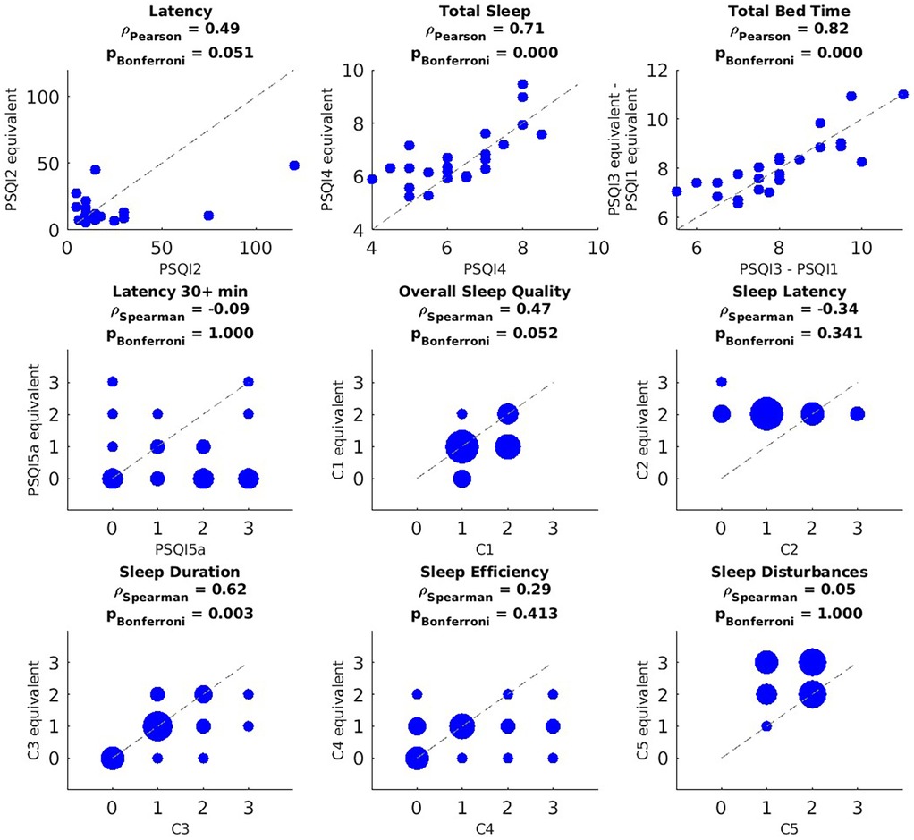 Figure 2. Correlation between PSQI measures and their Oura equivalents based on data recorded during the month preceding the PSQI questionnaire. PSQI question or component (x-axis) vs. its Oura-derived equivalent (y-axis). For the discrete variables (i.e., PSQI5a, C1–C5), blob size is proportional to the number participants in that value pair (bigger blobs in the y = x line mean less discrepancy between the subjective measure and its objective equivalent). P-values were corrected using Bonferroni across questions and components independently. After pairwise deletion, the sample size used for these correlations was n = 25.