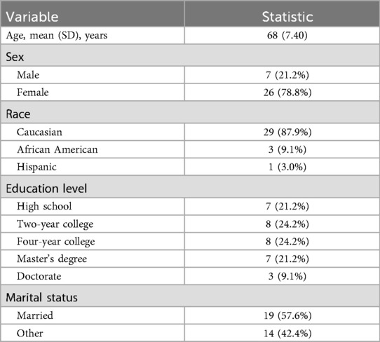 This secondary analysis draws on a double-blind, placebo-controlled, parallel-group pilot randomized clinical trial that examined the feasibility of a 4-week regimen of oral γ-aminobutyric acid (GABA) intake (18). The sample comprised 33 middle-aged to older adults recruited between March 2021 and February 2023. Eligibility for the parent study was determined via telephone screening. A detailed description of the screening, inclusion, and exclusion criteria of the parent study has been reported previously (18). In brief, adults aged ≥45 years who owned a smartphone, reported at least moderate pain intensity (>5/10) on most days during the preceding 3 months, and had poor sleep quality (PSQI-Total > 5) were considered for participation. Exclusion criteria included the inability to consent, pregnancy, cognitive impairment, psychiatric and neurological conditions (e.g., schizophrenia, major depressive disorder, bipolar disorder, Alzheimer's disease, Parkinson's disease, epilepsy, and other intracerebral pathologies), mental health–related hospitalization in the past year, serious systemic disorders, arterial hypotension, digestive tract diseases, recent major surgery, chronic or current use of certain medications (including sleep medications), history of alcohol or drug abuse, current cancer diagnosis (unless in remission for ≥2 years), allergies or sensitivity to GABA/placebo or their ingredients, and MRI contraindications. Table 1 summarizes the demographic characteristics of the sample.