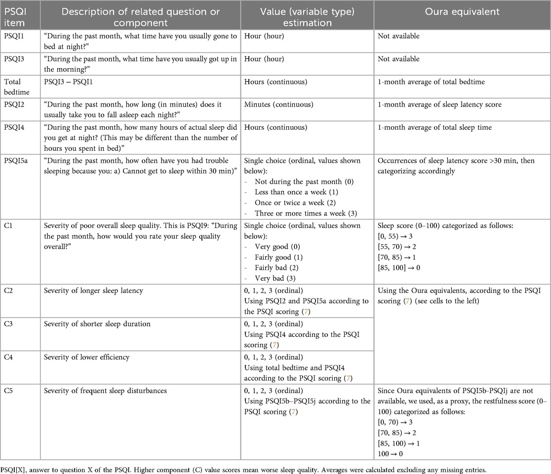 Table 2. Details of the calculation of Oura's equivalent items of the PSQI, used to test hypothesis 1.