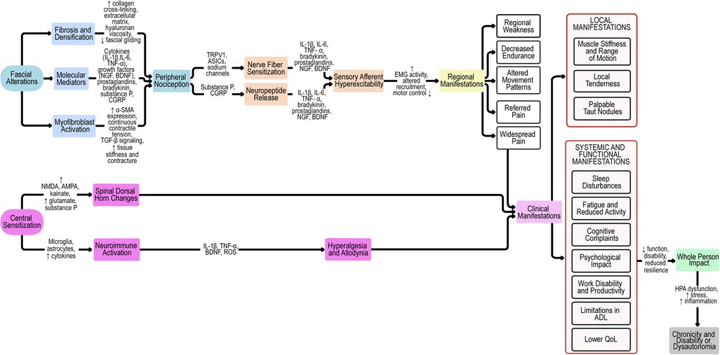 Figure 1. Pathophysiological cascade of fascia-related mechanisms in myofascial pain syndrome. Proposed pathophysiological model linking fascial alterations to peripheral and central sensitization, clinical manifestations, and whole-person impact. Fascial changes (fibrosis, densification, molecular mediators, and myofibroblast activation) drive peripheral nociception and contribute to nerve fiber sensitization, neuropeptide release, and sensory afferent hyperexcitability. These processes result in regional manifestations, local and systemic symptoms, which, together with central sensitization, culminate in widespread pain and whole-person impact. Chronicity and disability arise from maladaptive feedback loops and dysautonomia. ASICs, acid-sensing ion channels; α-SMA, alpha-smooth muscle actin; BDNF, brain-derived neurotrophic factor; CGRP, calcitonin gene-related peptide; EMG, electromyography; HA, hyaluronan; HPA, hypothalamic–pituitary–adrenal axis; IL, interleukin; NGF, nerve growth factor; NMDA, N-methyl-D-aspartate receptor; AMPA, α-amino-3-hydroxy-5-methyl-4-isoxazolepropionic acid receptor; ROS, reactive oxygen species; TGF-β, transforming growth factor beta; TNF-α, tumor necrosis factor alpha; QoL, quality of life; ADL, activities of daily living; TRPV1, transient receptor potential vanilloid 1.