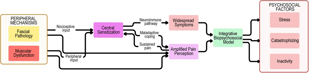 In contrast, an integrative model situates fascia as a peripheral initiator of nociceptive input, which interacts with muscle dysfunction and central sensitization. This alignment bridges the gap between local pathology and systemic pain amplification, supporting a biopsychosocial understanding that is clinically relevant (77). The concept echoes other conditions where peripheral tissue changes drive central changes, such as knee osteoarthritis or tendinopathy (78).