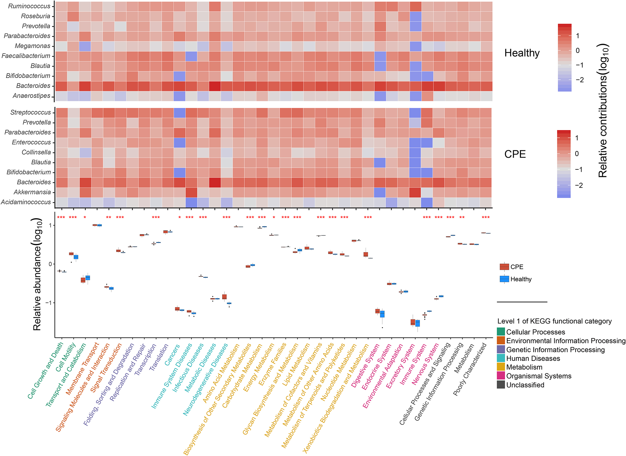 Distribution of functional categories for GM in CPE and Healthy groups. In the heatmap, the contributions of the top 10 genera on 37 KEGG level II functional categories were detected in CPE and Healthy groups, respectively. The deeper red square means the genera contribute to the functional category importantly, while the deeper blue square means the functional category obtained less contribution from the genera. In the box plot, the enriched pathways were compared between CPE and Healthy groups, and their P-values were indicated by asterisks. *, **, and *** stand for the P-value smaller than 0.05, 0.01, and 0.001, respectively. Functional classifications of KEGG level I were suggested by different colors, while the blue and red boxes represented Healthy and CPE groups, respectively.