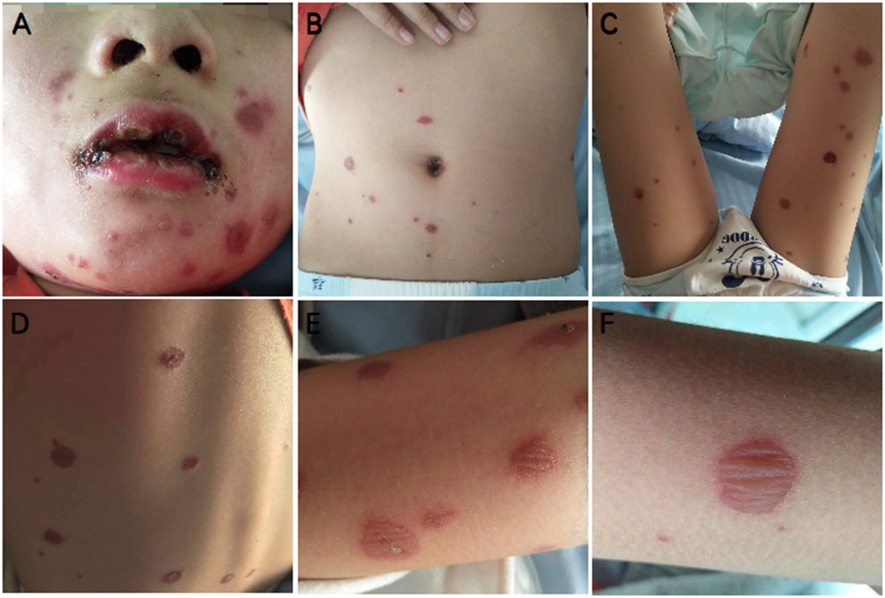 | Rash morphology | Macules, maculopapular, vesiculobullous | Macules, targetoid | Macules, maculopapular, vesiculobullous (d = 3 cm) | Maculopapular, vesiculobullous (d = 1 cm) | Maculopapular, vesiculobullous (d = 0.3–1 cm) |