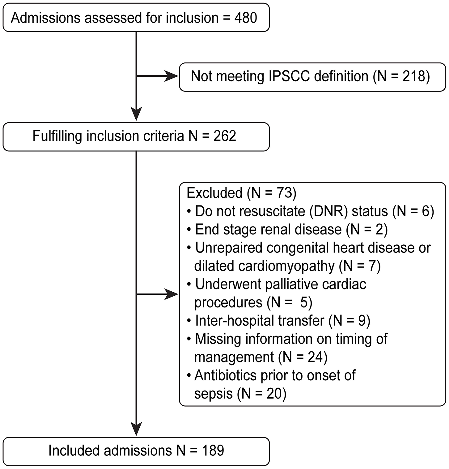 Children were excluded if they were diagnosed with an illness that might compromise the “volume resuscitation” component of the guidelines, which includes end stage renal disease, unrepaired congenital heart disease or dilated cardiomyopathy, or palliative cardiac procedures. In addition, children with do-not-resuscitate status, inter-hospital transferees after identification of sepsis and initiation of management, and children who were on antibiotics prior to the onset of sepsis were excluded. A total of 480 admissions were reviewed, of which 189 were included in the analysis (Figure 1). The study was approved by the Institutional Review Board at the King Abdullah International Medical Research Center, and the requirement for informed consent was waived.