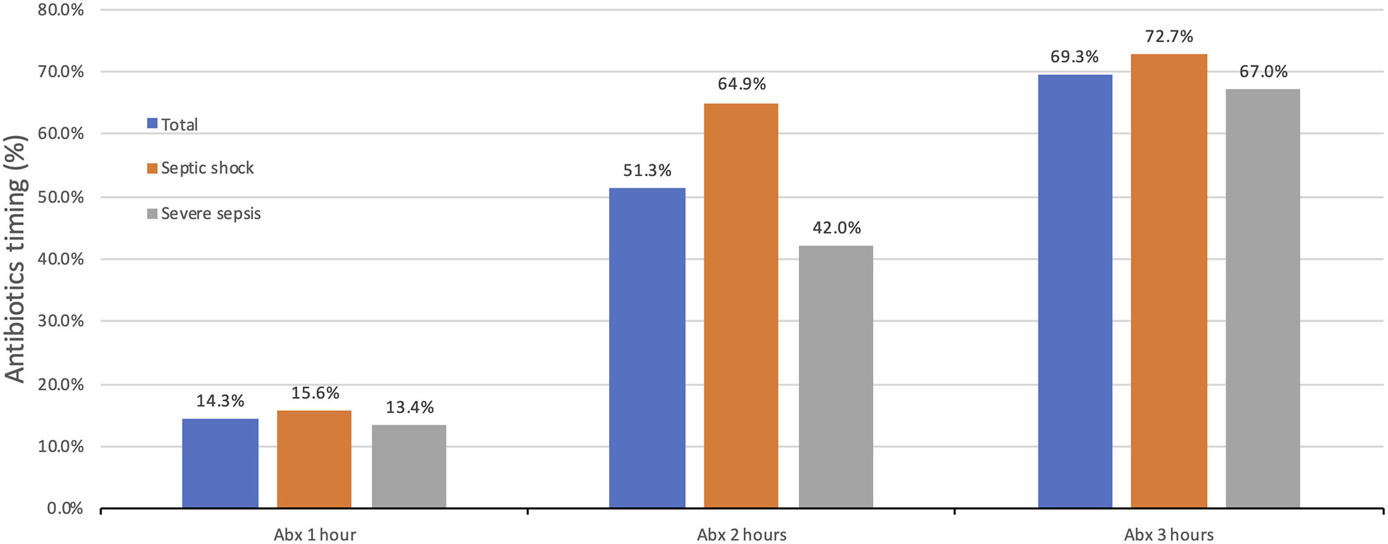 The percentage of children who received antibiotics within 1 h of the onset of sepsis was 14.3% (n = 27 out of 189), while 51.3% (n = 97 out of 189) received antibiotics within 2 h (Figure 2). The overall median time from sepsis recognition to antibiotic administration was 105 min (IQR: 65–185.5 min); for septic shock patients, it was 85 min (IQR: 55–148 min), and 130 min (IQR: 75.5–199 min) for severe sepsis.