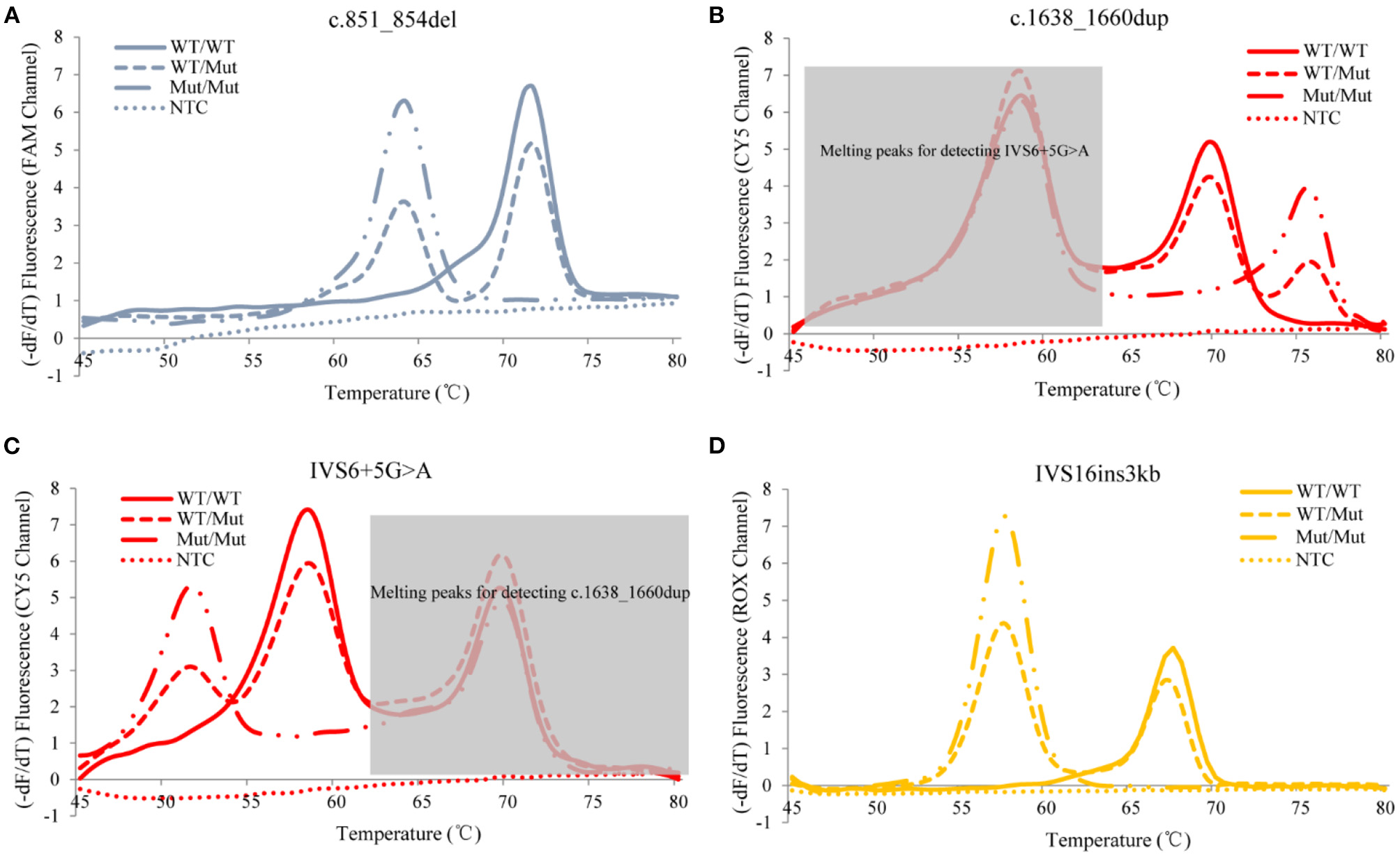 Representative genotyping results of the four prevalent SLC25A13 mutations using the MMCA assay. Melting curves and fluorescence melting peaks, as well as corresponding genotypes, are provided according to the detection mutations above the panel [(A) c.851_854del; (B) c.1638_1660dup; (C) IVS6+5G>A; (D) IVS16ins3kb]. In each panel, melting curves are displayed in only one channel that is related to the detection mutation, and marked on the y-axis. The mutations are individually identified by their labeling fluorophores and Tm values, and all mutant alleles generate distinct melting peaks corresponding to the wild-type alleles. –dF/dT, the negative derivative of fluorescence over temperature; WT, wild-type; Mut, mutant; NTC, no DNA template control; MMCA, multicolor melting curve analysis.