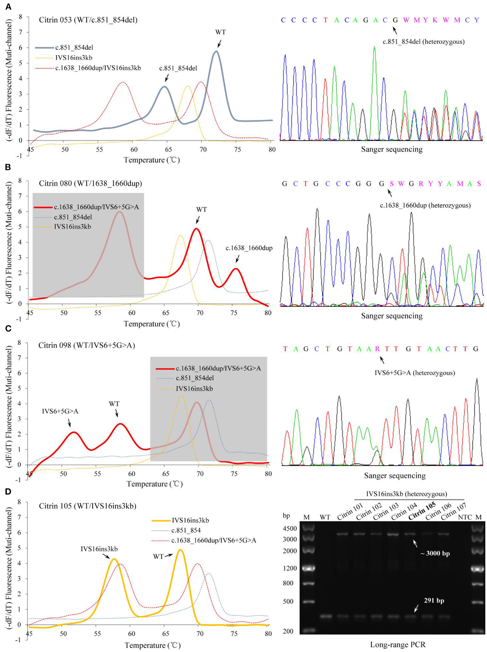 Identification of SLC25A13 genotypes in the newborn cohort using the MMCA assay. Representative melting curves and fluorescence melting peaks of 4 SLC25A13-mutation carriers are presented in the left panels, and the specimen number and genotype of each mutation carrier are marked above the panels [(A) Citrin 053, c.851_854del heterozygous carrier; (B) Citrin 080, c.1638_1660dup heterozygous carrier; (C) Citrin 098, IVS6+5G>A heterozygous carrier; (D) Citrin 105, IVS16ins3kb heterozygous carrier]. In each panel, melting curves are displayed in the multi-channel, and the channel revealing the occurrence of the mutation is presented as a solid line. The results of the MMCA assay were further detected by Sanger sequencing and Long-range PCR, obtaining the fully consistent results, which are presented in the right-hand panels. –dF/dT, the negative derivative of fluorescence over temperature; M, marker; WT, wild-type; Citrin 101 to 107, IVS16ins3kb heterozygous carriers; NTC, no DNA template control; MMCA, multicolor melting curve analysis.