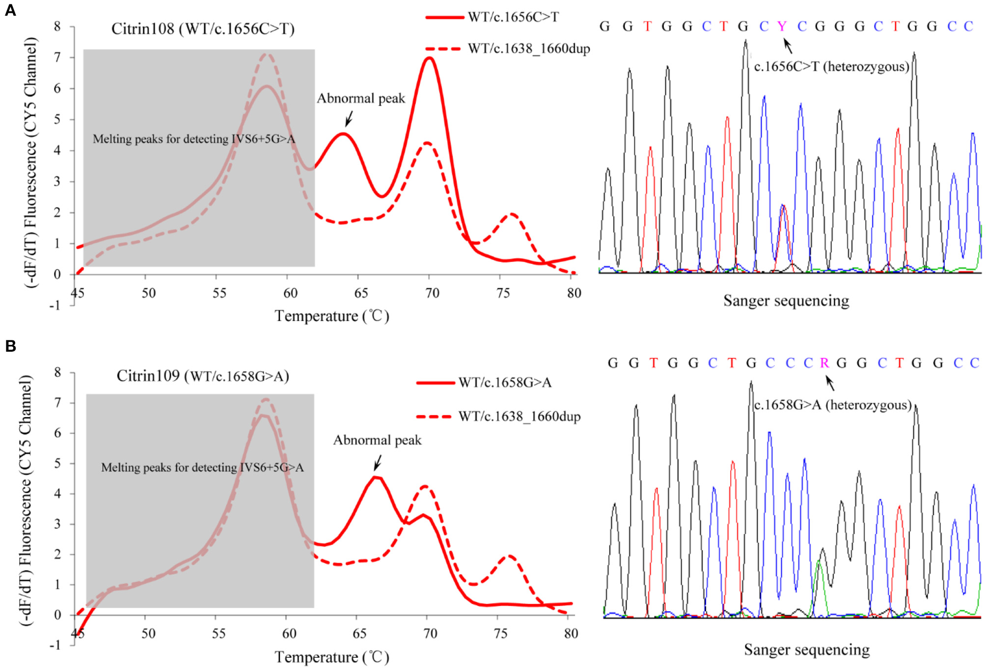 Abnormal fluorescence melting peaks in the MMCA assay. MMCA genotyping of the SLC25A13 c.1638_1660dup mutation displayed abnormal melting peaks with unexpected melting temperature values in three screening samples, and Sanger sequencing of the probe region uncovered one sample carrying (A) heterozygous c.1656C>T mutation and (B) two others carrying heterozygous c.1658G>A mutation (one representative is shown). Melting curves are only displayed in the CY5 channel, and the abnormal melting peaks are marked in the solid lines that correspond to the melting curves of the screened samples. The dashed line represents the melting curve of WT/ c.1638_1660dup genotype, indicating the positions of normal melting peaks. –dF/dT, the negative derivative of fluorescence over temperature; WT, wild-type; MMCA, multicolor melting curve analysis.