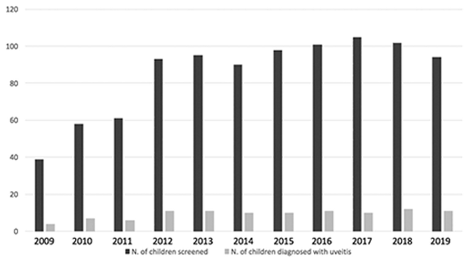 Bar graph showing distribution of patients with JIA screened and diagnosed with uveitis during eleven-year screening period.