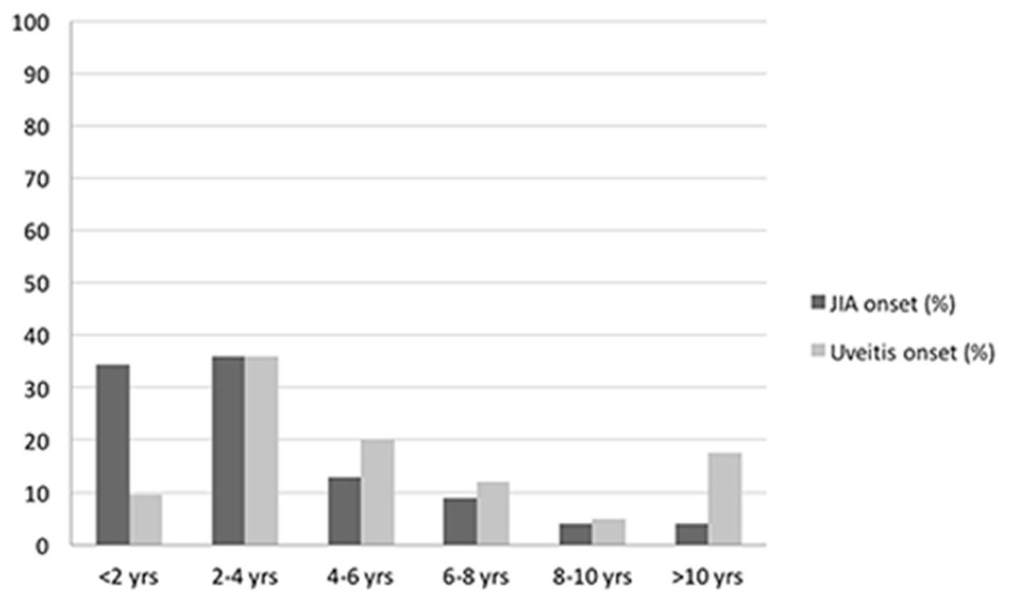 Bar graph showing age distributions of patients at diagnosis of JIA and uveitis.