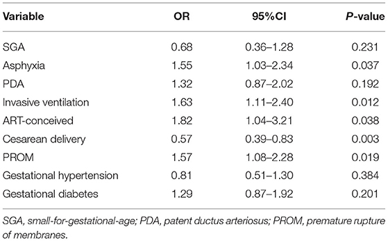 After adjusting for the influence of confounding factors, ART conception was identified as an independent risk factor for WMI. After adjusting for the effects of SGA, asphyxia, PDA, invasive ventilation, cesarean, PROM, gestational hypertension, and gestational diabetes, the odds ratio of ART conception was 1.82 (95% confidence interval: 1.04–3.21; Table 3).