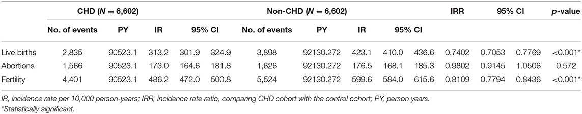 Results: The CHDs had an inferior rate of live births (IRR 0.74 [95% CI 0.71–0.78]) than the non-CHD group. There was also a lower fertility rate in the CHD group (IRR 0.81 [95% CI 0.78–0.84]) than the non-CHD group. Abortion rates between the two groups were similar.