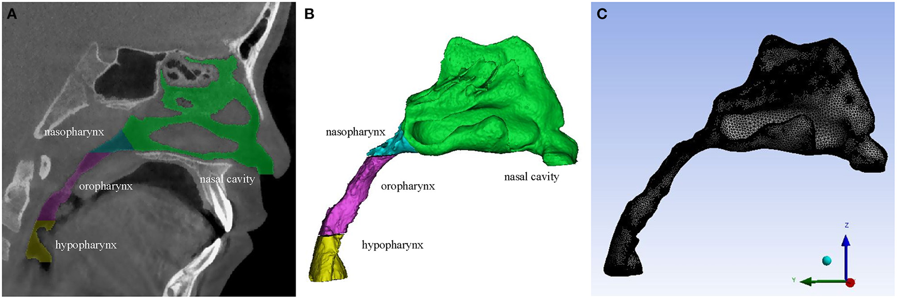 (A) A CBCT slice of the upper airway. (B) 3D model of the upper airway. (C) Mesh generation of the upper airway 3D geometry.
