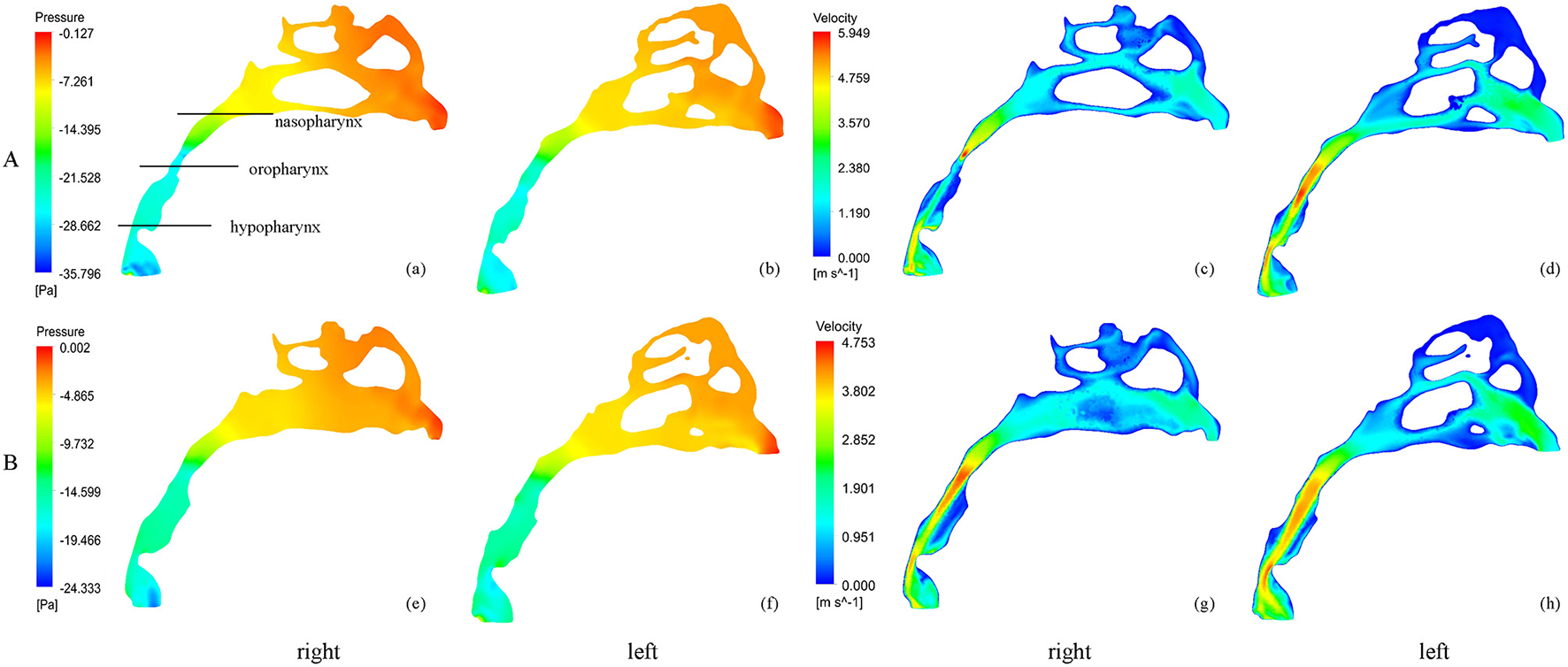 The pressure and velocity profile of the airflow before and after RME. (A) before RME, (B) after RME.