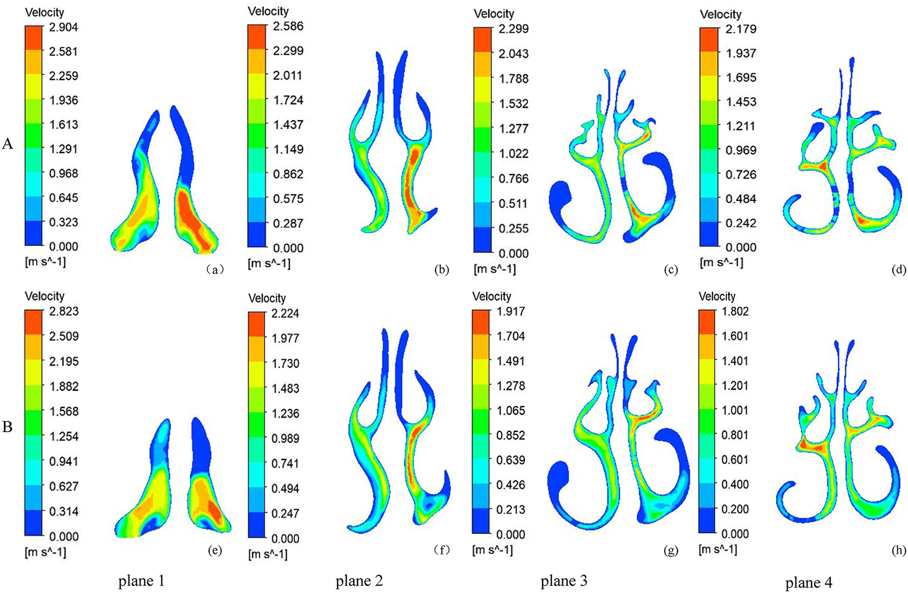 The velocity magnitude contours at five coronal sections of a typical subject with nasal septal deviation. (A) before RME, (B) after RME.