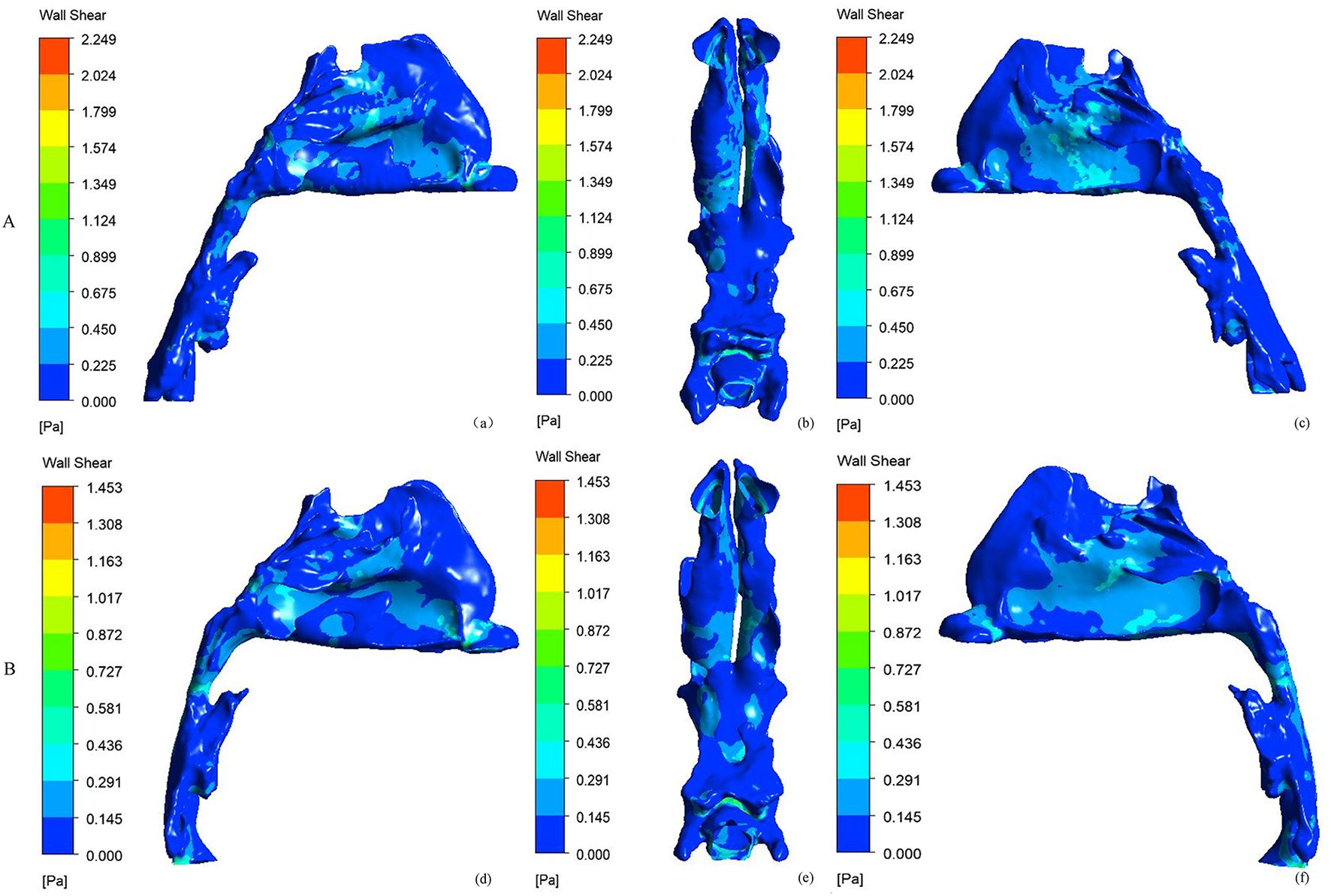 Side and bottom views of the wall shear stress (Pa) of nasal cavity. (A) before RME, (B) after RME.