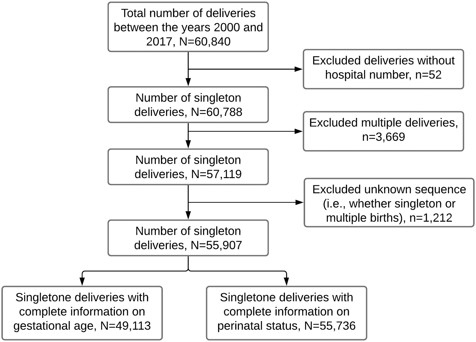 Flow chart showing the number of singleton deliveries analyzed in this study. Data from the Kilimanjaro Christian Medical Center (KCMC) Medical birth registry, 2000–2017.
