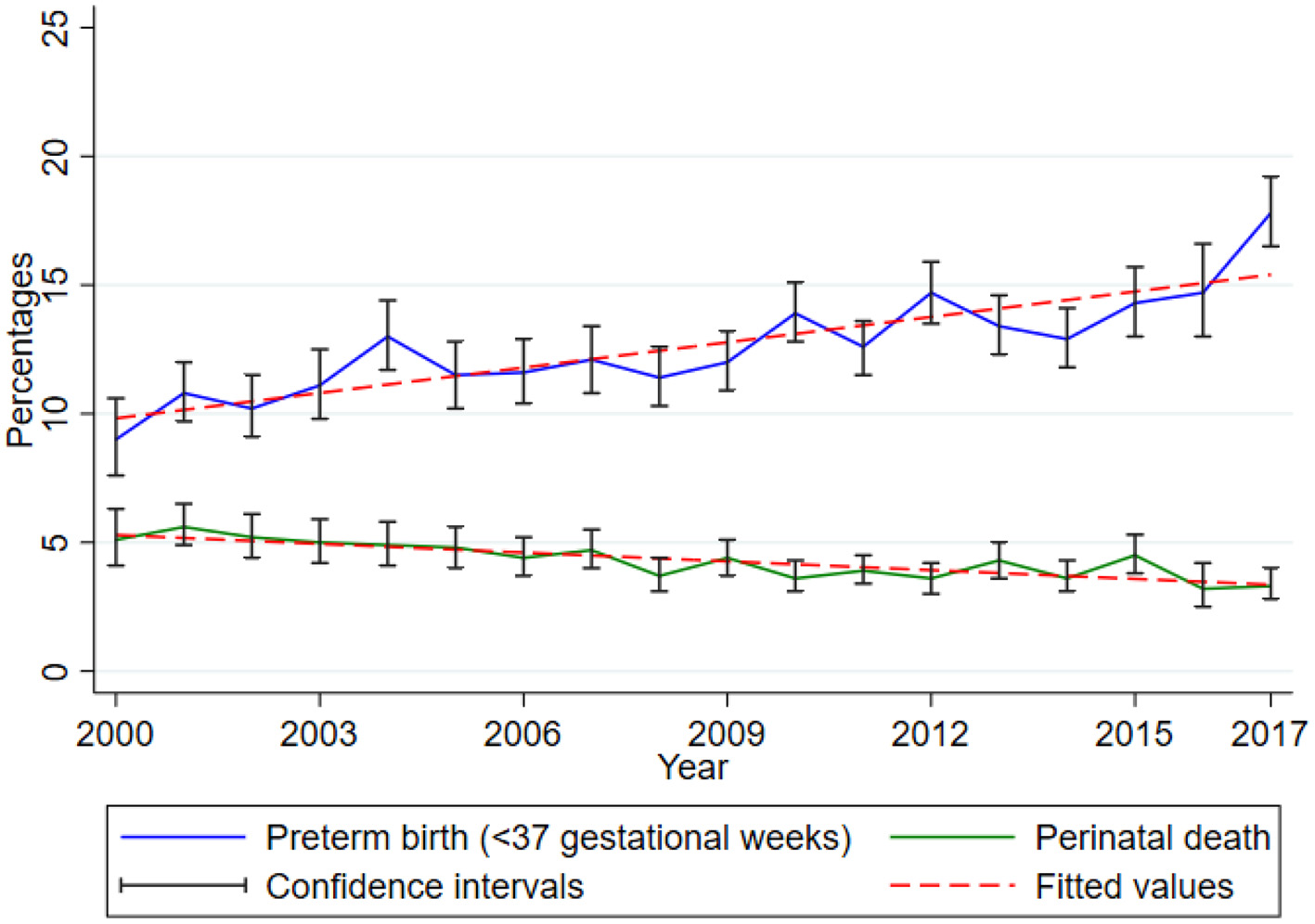 The secondary outcome was the co-occurrence of preterm birth and perinatal death. We generated a categorical variable from the two outcomes with the following categories; “0” if none of the events occurred, “1” if both occurred, “2” if perinatal death only, and “3” if preterm birth only occurred. We then used a multinomial random-effects regression model to predict the independent and co-occurrence of preterm birth and perinatal death.