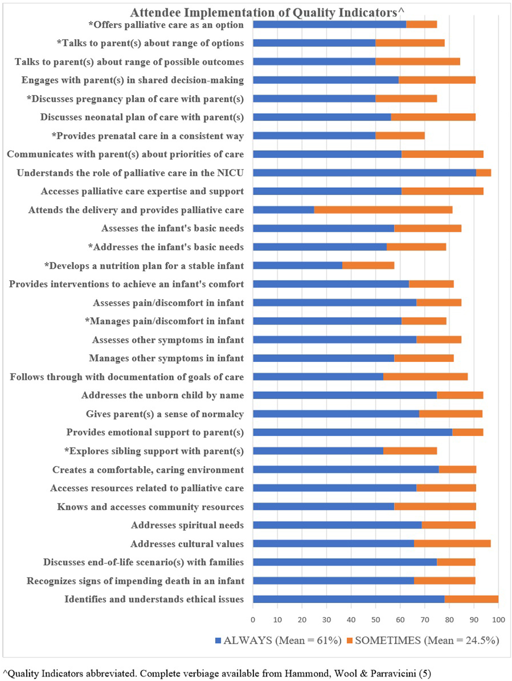 Frequency data from attendees' self-reported responses for “always” and “sometimes” for each QI is shown in Figure 2. When each QI total score was computed, 16 of the QIs were in the highest threshold of ≥ to 90%, 8 were in the 80–89.9% threshold, and 7 were in the 70–79.9% threshold. One QI, developing a nutrition plan for an infant with a life-limiting condition who is breathing and stable on room air, was below the 70th percentage threshold. All QIs below the 79.9% threshold are indicated with an asterisk on Figure 3. The mean average of total scores indicating an “always” response was 61.3%, and those indicating a “sometimes” response was 24.5%.