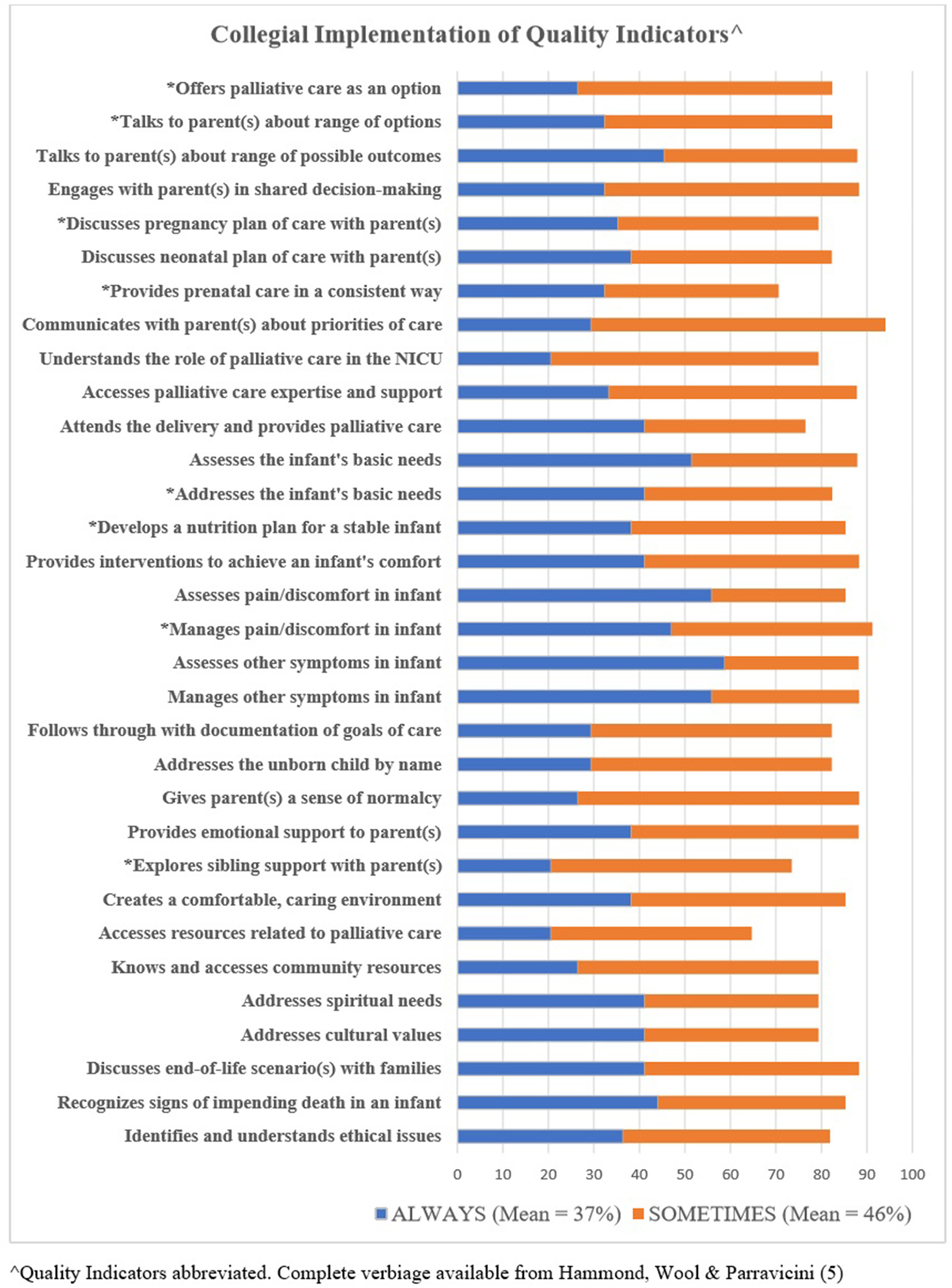 Course attendees provided a report regarding collegial implementation for each QI. Figure 3 reflects responses for “always” plus “sometimes.” When each QI total score was computed, two of the QIs were in the highest threshold of ≥ to 90%, 21 were in the 80–89.9% threshold, and eight were in the 70–79.9% threshold. One QI, accesses resources related to perinatal palliative care (clinical resource materials, continuing education), was below the 70th percentage threshold. All QIs below the 79.9% threshold are indicated with an asterisk on Figure 3. The mean average of total scores indicating an “always” response was 37%, and those indicating a “sometimes” response was 46%.