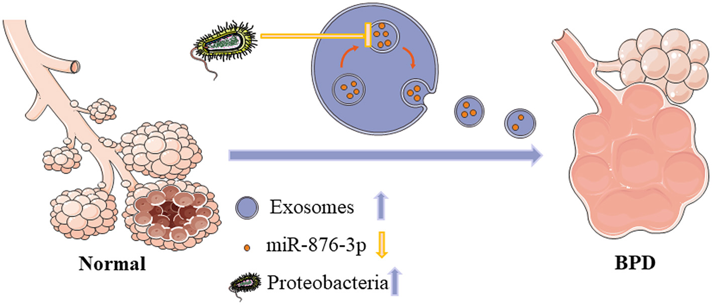 Recent studies have confirmed the roles of exosomes and miRNAs contained within exosomes in cell differentiation and tissue and organ development. Such studies have also indicated that miRNAs play an important role in lung development and lung injury (68). Another study conducted by Lal et al. found that increased exosomes content in the airway secretions of preterm infants (born at <28 weeks of gestation) with severe BPD, although the expression of miR-876-3p in exosomes was decreased. These findings suggest that low expression of miR-876-3p can be used to predict the occurrence and development of BPD in preterm infants. The authors also noted that Proteobacteria can regulate the expression of miR-876-3p (Figure 2). In the BPD model, Proteobacteria can increase the release of exosomes but reduce the expression of miR-876-3p, thus inhibiting alveolar development and leading to the occurrence and development of BPD. This study demonstrated the presence of a respiratory tract microbiota-exosome-miRNA regulatory network in the pathogenesis of BPD, which may aid in predicting the development of BPD in premature infants (69).
