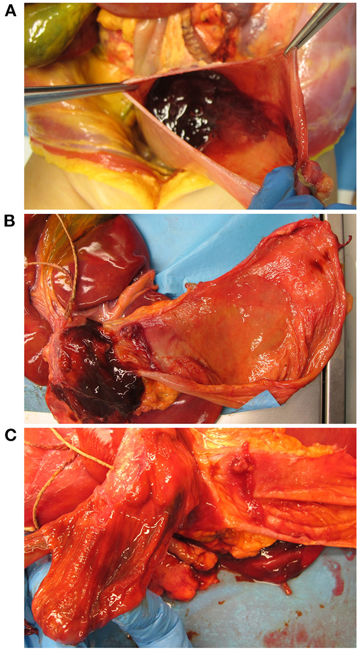 At autopsy, blood presence was observed in the lumen of the upper tracts of the alimentary canal (i.e., the oral cavity, pharynx, esophagus, stomach, and duodenum) in the absence of wall injury (Figures 1A–C).
