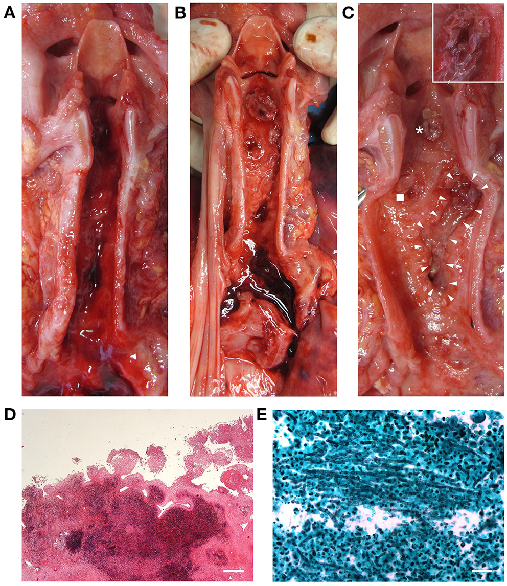 Macroscopic examination of the laryngeal cavity and tracheal lumen. Opening of the larynx, trachea, and bronchi with evidence of blood (A). Laryngotracheal ulcerative lesions with presence of some necrotic pseudomembranous-like features (asterisk, cricoid lesion; square, left anterolateral tracheal lesion; triangles, right anterolateral tracheal lesion) consistent with invasive Aspergillus laryngotracheitis (B,C); the insert in (C) shows a magnification of the site corresponding to tracheal wall perforation and thyroid artery damage. Histopathologic examination by hematoxylin and eosin of the laryngeal mucosa at the site of ulceration (transversal section), showing inflammatory infiltration and signs of tissue necrosis (Scale bar: 400 μm) (D). Grocott–Gomori's methenamine silver stain showing Aspergillus branching hyphae (black) infiltrating the laryngotracheal wall in a necrotic ground (E) (Scale bar: 50 μm).