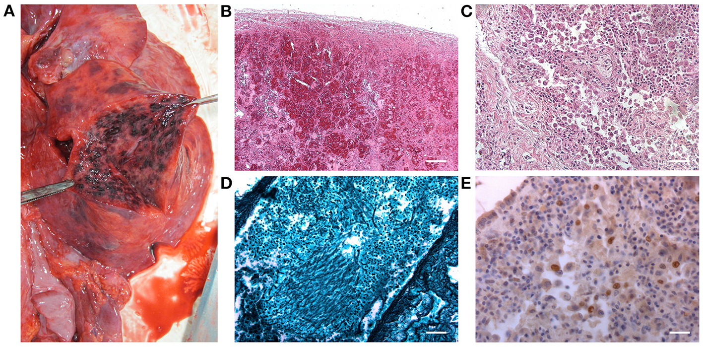 Macroscopic appearance of the inferior lobe of the right lung after surface incision (A). Histopathological characterization by hematoxylin and eosin stain of the right lung parenchyma: hemorrhagic invasion of the air spaces (B) and the typical appearance of the tissue in interstitial pneumonia (C) were detected [Scale bars: 200 μm (B); 50 μm (C)]. Grocott–Gomori's methenamine silver stain showing Aspergillus branching hyphae (black) infiltrating the lung parenchyma (D) (Scale bar: 50 μm). Immunohistochemical staining for CMV, highlighting the presence of immunoreactive cells (E) (Scale bar: 25 μm).