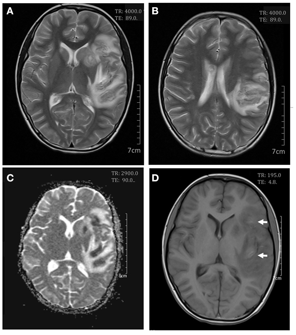 The patient presented with fever, an ulcer on the lip, alopecia, malar rash, and rashes on the limbs. The initial laboratory results revealed leukopenia (white blood cell count 2.02 × 109/L, lymphocyte count 0.70 × 109/L), autoimmune hemolysis (hemoglobin 79 g/L), low C3 [0.26 g/L (normal range 0.9–1.8 g/L)], low C4 [0.04 g/L (normal range 0.1–0.4 g/L)], and antibody abnormalities. The antinuclear antibody was positive with a titer of 1:160; the anti-double-stranded DNA and anti-Smith antibodies were positive. Besides, laboratory data on admission also showed hyperferritinemia (ferritin > 1,500 μg/L), hypertriglyceridemia (4.87 mmol/L), and elevated levels of aspartate aminotransferase (123 U/L) and lactate dehydrogenase (621 U/L). The fibrinogen level (2.75 g/L) and urinalysis were normal. Cerebrospinal fluid and bone marrow examination on day 2 showed no infection or macrophages phagocytosing hematopoietic cells. Cerebral magnetic resonance imaging (MRI) was taken on day 4, revealing T2-white matte hyperintensities in her left frontal lobe and left lentiform nucleus (Figure 1). The presence of clinical and laboratory criteria led to the diagnosis of SLE and SLE-associated MAS.