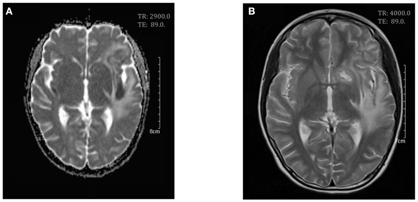 Cerebral magnetic resonance imaging on day 25. Axial T2-weighed scan (A) and apparent diffusion coefficient (ADC) maps (B) showed a decrease in white matter swelling.