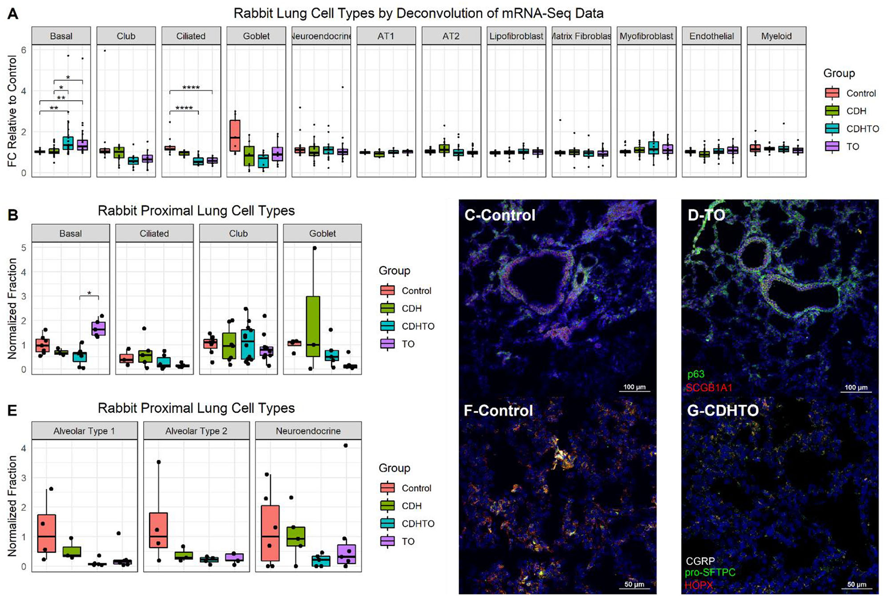 Increased basal cells in a rabbit model of fetal tracheal occlusion. (A) Lung cell-specific mRNAs and the relative expression of each in rabbit fetuses with sham surgery, diaphragmatic hernia creation (CDH), tracheal occlusion (TO), or both (CDHTO) were identified. Each data point represents the relative expression of one gene per group (n = 4 per group). This analysis identified a relative increase in basal cell- and a reduction in ciliated cell-associated genes. *p < 0.05, **p < 0.01, ****p < 0.0001 by Dunn's post-hoc test with Bonferroni correction. (B) Immunostaining and quantitative image analysis of the upper left lobe rabbit lung showing a relative increase in the number of basal cells as a fraction of the total cells in TO lung (n = 4–6 per group). (C) The basal cell master regulator p63 was present in conducting airways of control rabbit fetuses largely below SCGB1A1-positive club cells. (D) The relative abundance of p63-positive cells was increased in the lungs of TO rabbit fetuses. (E) Apparent reductions of both alveolar type 1 and type 2 cells were not statistically significant. (F) Immunostaining for the alveolar type 2 cell marker pro-surfactant protein C (pro-SFTPC) and the alveolar type 1 cell marker HOPX in sham-treated fetal rabbit lung. (G) CDHTO lung appeared to have reductions in both markers.