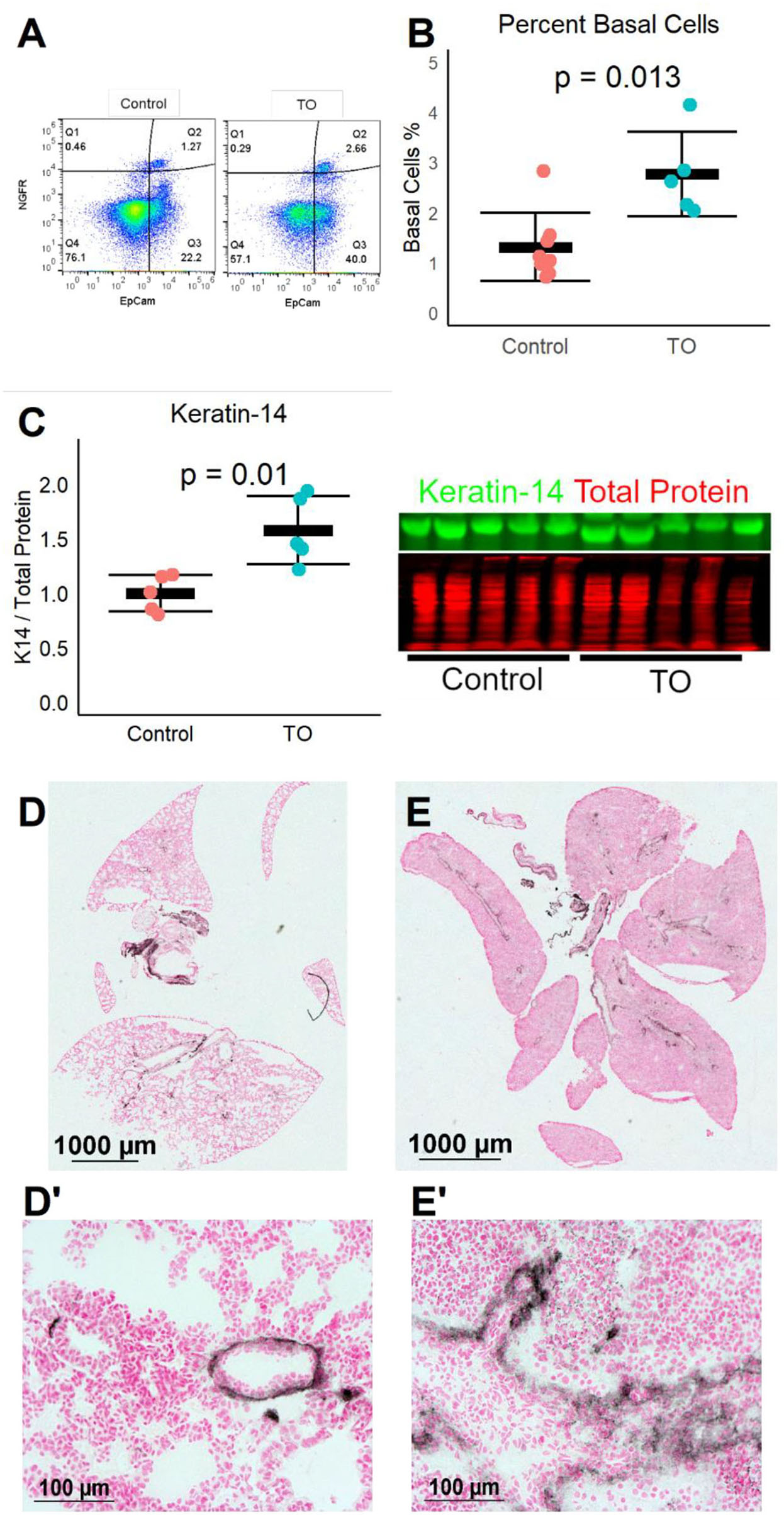 Fetal endoscopic tracheal occlusion (FETO) increases the number and distalization of lung basal cells. (A) The percentage of lung basal cells as defined by the co-expression of EpCam and NGFR increased from ~1.5 to ~2.5% at E18.5 following tracheal occlusion (TO) at E16.5. (B) The increased percentage of basal cells in TO (n = 6) compared to control (n = 7) was consistent and statistically significant. (C) The whole-lung protein content of the basal cell marker keratin-14 was also increased (n = 5 per group). (D) Immunohistochemistry of control lung for NGFR showed restriction of basal cells to the basement membrane of large conducting airways. (E) FETO lungs had increased cellularity and had extension of basal cells beyond the central conducting airways into the more distal conducting airways. (D′), Magnified Image of D; (E′), Magnified Image of E.