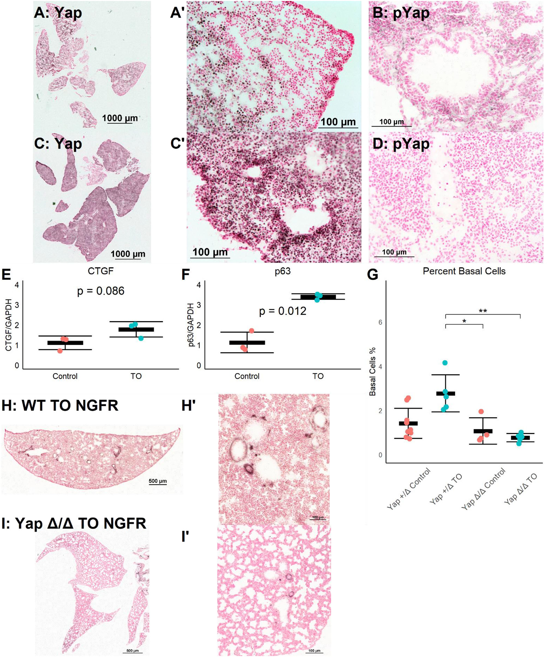 Increased lung epithelial Yap signaling is responsible for basal cell expansion. (A,B) In control E18.5 fetuses, non-phosphorylated (nuclear, active) Yap is present in small clusters of distal lung cells (A) and phosphorylated (cytosolic, non-active) Yap is widely present (B). (C) In E18.5 TO lung, non-phosphorylated Yap is present more homogenously throughout the lung and can be detected more in nuclei than in control, with denser abundance of nuclear-Yap-containing cells round airways. (D) In TO lung, phosphorylated Yap is less abundant than in control lung. (E,F) PCR of lung homogenates showed increased levels of connective tissue growth factor (CTGF) (E) and p63(F). Both are Yap target genes. Comparison is by Welch's t-test. (G) Mice with hemizygous deletion of lung epithelial cell Yap at baseline (n = 9) and after TO (n = 5) showed similar numbers of basal cells to wild-type (WT) mice. Lung epithelial cell-specific deletion of Yap without TO (n = 4) or with TO (n = 5) both had basal cell frequencies comparable to control hemizygous and WT mice. *p < 0.05, **p < 0.01 by Holm–Sidak post-hoc test. (H,I) Compared to wild-type (H), mice with conditional deletion of Yap from the lung epithelium (I) had reduced abundance of basal cells as assessed by nerve growth factor receptor (NGFR) immunohistochemistry. Scale bars, 500 and 100 μm. (A′), Magnified Image of A; (C′), Magnified Image of C; (H′), Magnified Image of H; (I′), Magnified Image of I.
