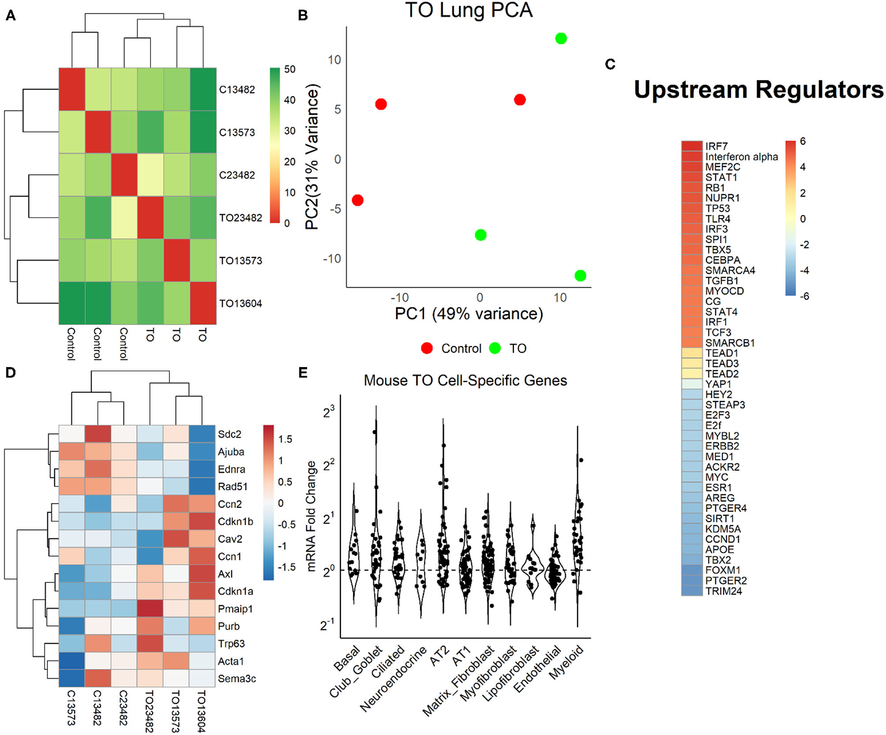 We examined the relative weight of Yap transcriptional activity compared to other impacted signaling pathways by performing mRNA sequencing (mRNA-seq) and differential gene expression analysis in three control and three TO E18.5 lungs. TO lungs were most similar to each other (Figure 4A), although the separation between control and TO specimens was incomplete when assessed by the first two principal components (Figure 4B). After filtering for genes that contained at least five reads in three or more of the specimens, 17,374 genes were used in the analysis. Among these genes, only 42 had adjusted p-values of <0.1. GSEA of these genes identified inflammation-related, tube morphogenesis, and blood vessel morphogenesis processes as differentially regulated (Supplementary Table 2). For further analysis, we analyzed genes that were 2-fold increased (626 genes) or decreased (207 genes). Among the upregulated genes, the biological processes that were activated were cardiac and striated muscle function-related, and there were no significant molecular functions identified among the downregulated genes (Supplementary Figure 2). Upstream analysis of genes with a 2-fold change in expression identified interferons and Toll-like receptors as activated, but it also identified regulators important in cell cycle and lung development, such as TBX5, SPI1, CEBPA, TGFB1, AREG, FOXM1, and CCND1 (Figure 4C). Yap/Taz phosphorylation was predicted to be decreased (activation z-score = −0.82, adjusted p = 1.49 × 10−7) and TEAD2 activity increased (activation z-score = 1.63, adjusted p = 2.7 × 10−7) in this analysis, but the relative weights of these differences were smaller than those of other regulators. Clustering of specimens using genes known to be regulated by Yap showed that TO and control specimens were distinct from one another (Figure 4D). In performing analysis of lung cell-specific mRNAs similar to that done in fetal rabbit lungs, it was found that basal cells, club/goblet cells, AT2, and myeloid cell mRNAs were increased in TO lung compared to control (Figure 4E).
