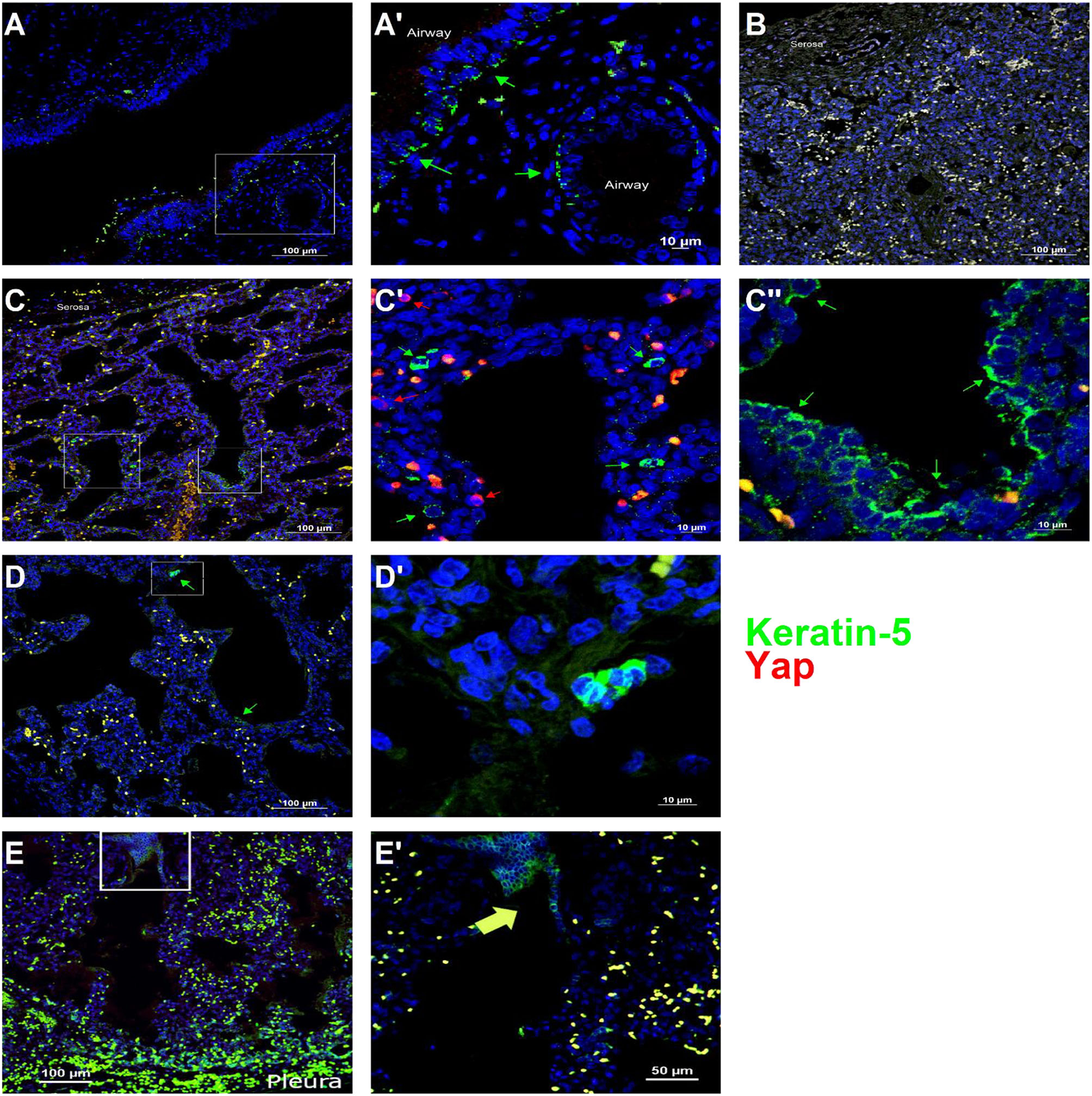 Basal cells are present in the distal lung of infants with congenital high airway obstruction (CHAOS). (A) Staining was performed on lung specimens from infants of gestational age 34–36 weeks who died within 48 h of birth with CHAOS, being a human analog to mouse tracheal occlusion. The lungs of both CHAOS and control infants had keratin-5-positive cells (green arrows) beneath the pseudostratified epithelium of the large conducting airways. (B) The subpleural lung of control specimens had no keratin-5-positive cells. (C) CHAOS lung had regions with clusters of keratin-5-positive cells. None of these cells were Yap-positive (red arrows), although cells containing both cytoplasmic and nuclear Yap were observed near keratin-5-positive cells. (D) Another CHAOS lung specimen showing clusters of keratin-5-positive cells just below the pleura. (E) Specimen of an infant with congenital diaphragmatic hernia treated with fetal endoscopic tracheal occlusion who died shortly after birth. In airways just below the pleura, clusters of keratin-5-positive basal cells can be identified. (A′), Magnified Image of A; (C′), Magnified Image of C-box 1; (C″), Magnified Image of C-box 2; (D′), Magnified Image of D; (E′), Magnified Image of E.