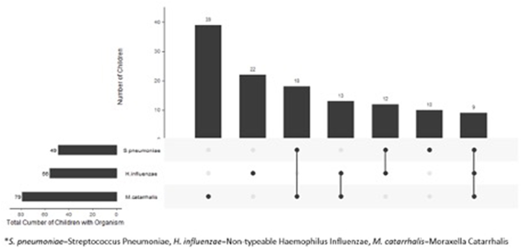Compared to children with normal flora, children colonized with bacteria were younger (4.2 vs. 7.6 years, p < 0.01) and were more likely to be non-white (p = 0.03) (Table 1). We found no difference in gender or clinical presentation between two groups (Table 1). Among children colonized with bacteria, 71/123 (58%) were colonized with a single pathogen and 52 (42%) were colonized with >1 pathogen. The most frequently cultured bacteria was Moraxella catarrhalis (n = 79) (Figure 1).