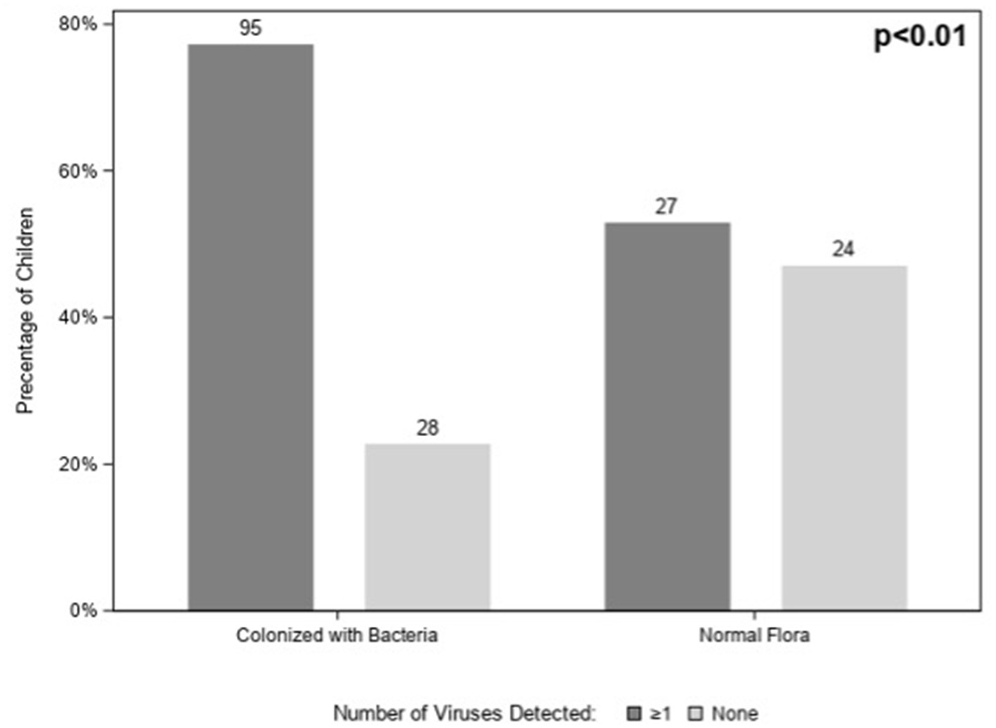 Results: We enrolled 174 children; 123 (71%) had a positive culture for potentially pathogenic bacteria and 51 (29%) had normal flora. 122/174 (70%) tested positive for one or more viruses. Compared to children with normal flora, children with pathogenic bacteria were more likely to have viruses (p < 0.01), but this relationship disappeared when we adjusted for age. Children with pathogenic bacteria in their nasopharynx and children with normal flora had similar levels of nasal cytokines.