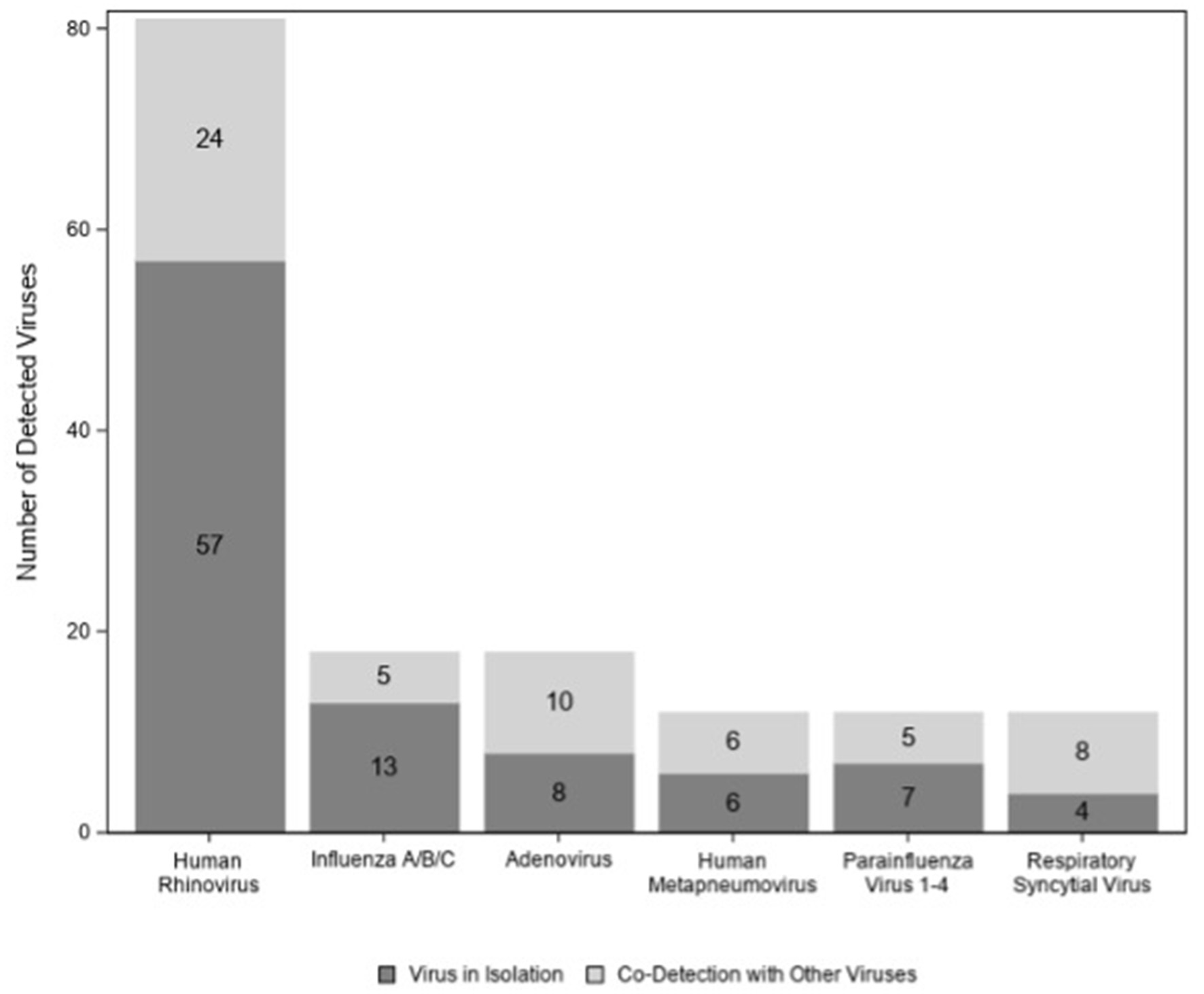 A total of 122/174 (70%) children tested positive for at least one virus. Viruses (n = 95; 77%) were more likely to be detected in children colonized with bacteria than in those with normal flora (n = 27; 53%) (p < 0.01) (Figure 2); however, this association disappeared when we controlled for age (p = 0.06) (data not shown). Among those 122 children with virus(es), HRV was the most commonly detected virus (n = 81) followed by influenza virus (n = 18) and adenovirus (n = 18) (Figure 3). There were no significant differences in the cycle threshold values between groups (data not shown).