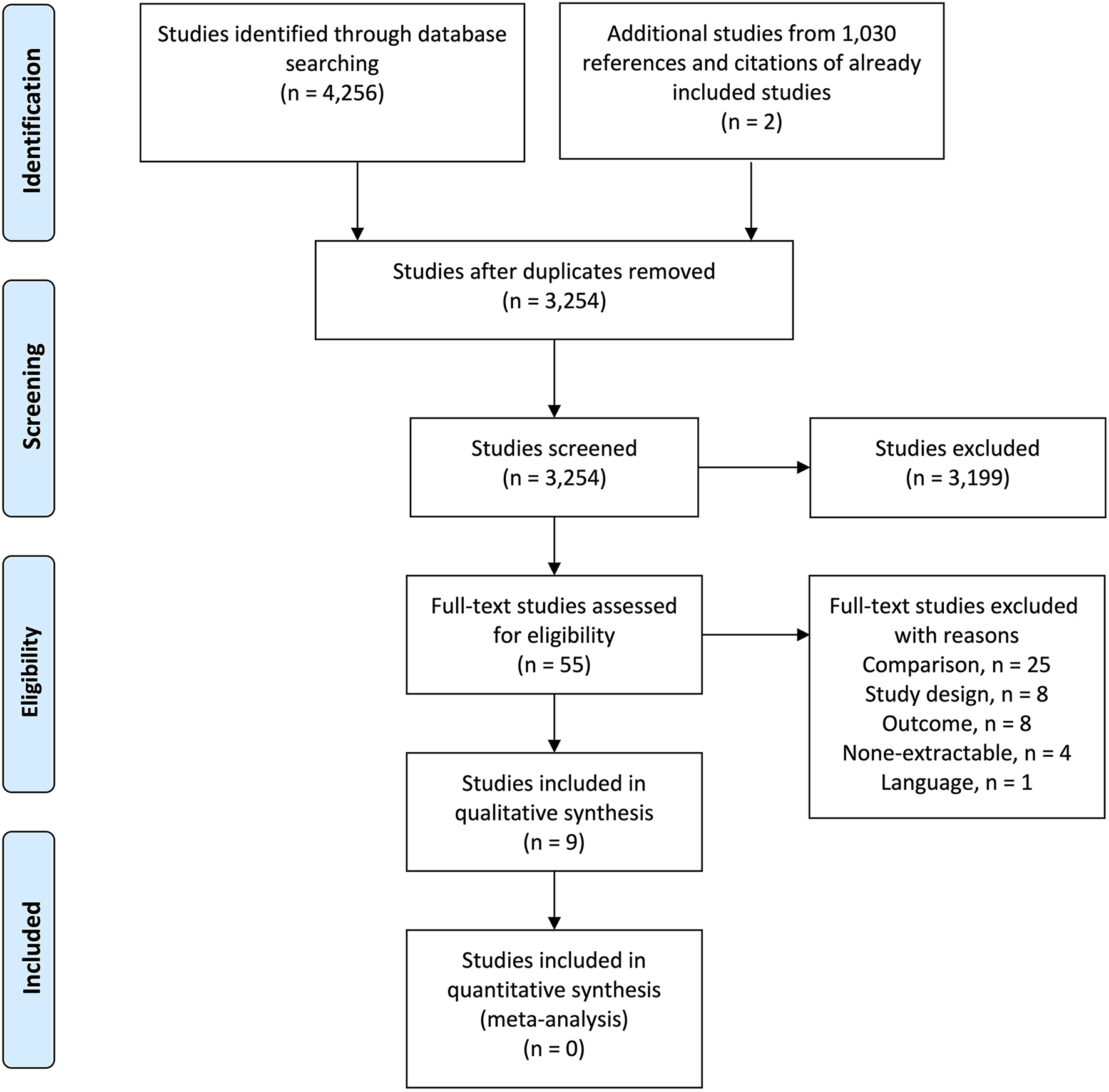 A total of 4,256 studies were identified across all databases. After removal of duplicates, 3,254 studies were screened for inclusion. Of these, 55 studies were evaluated by full-text and seven studies were eligible for inclusion. Two additional studies were included following screening of 1,030 references and citations from already included studies. This led to inclusion of nine studies for this systematic review (55–63). An overview of the selection process is illustrated in the PRISMA flow diagram (Figure 1).