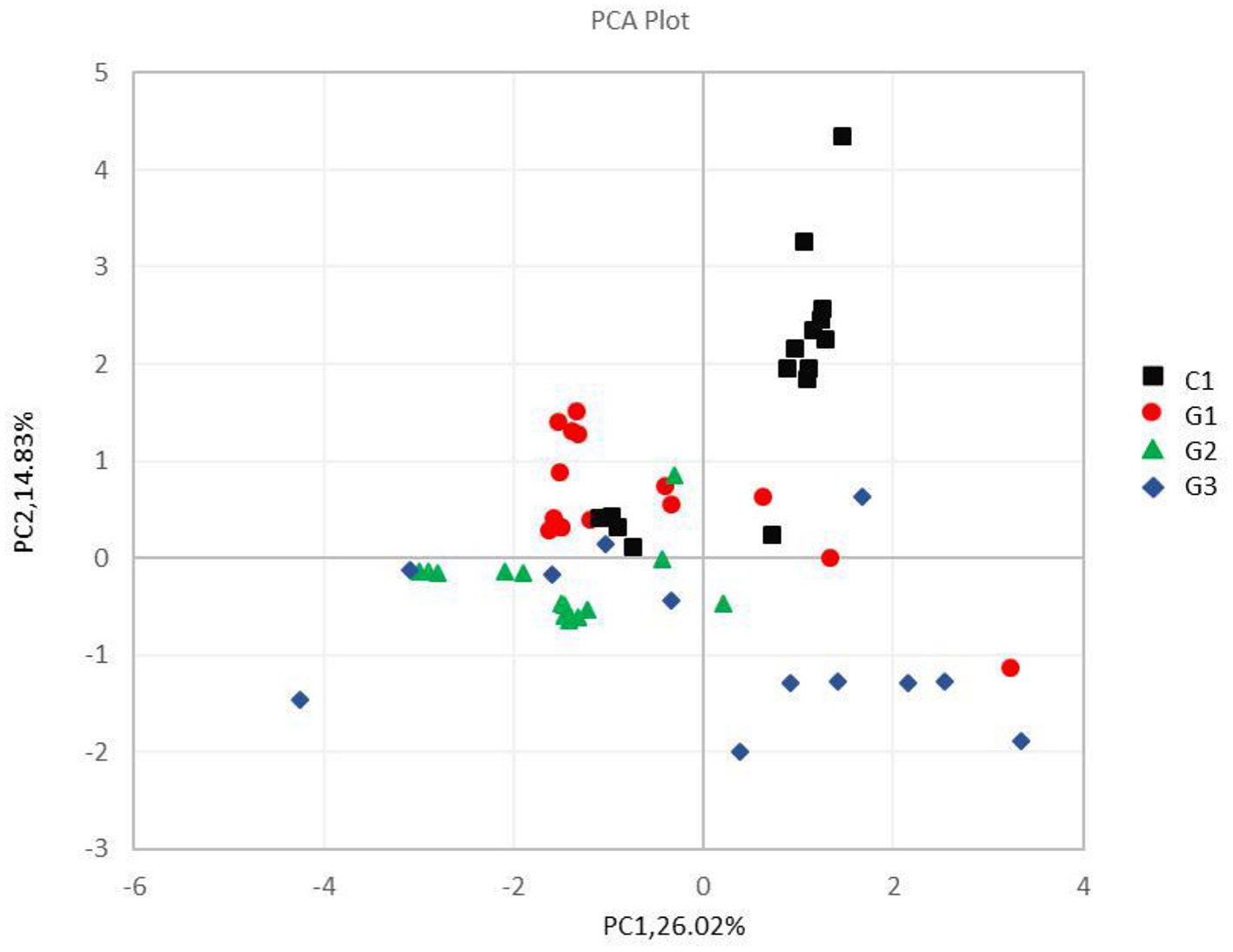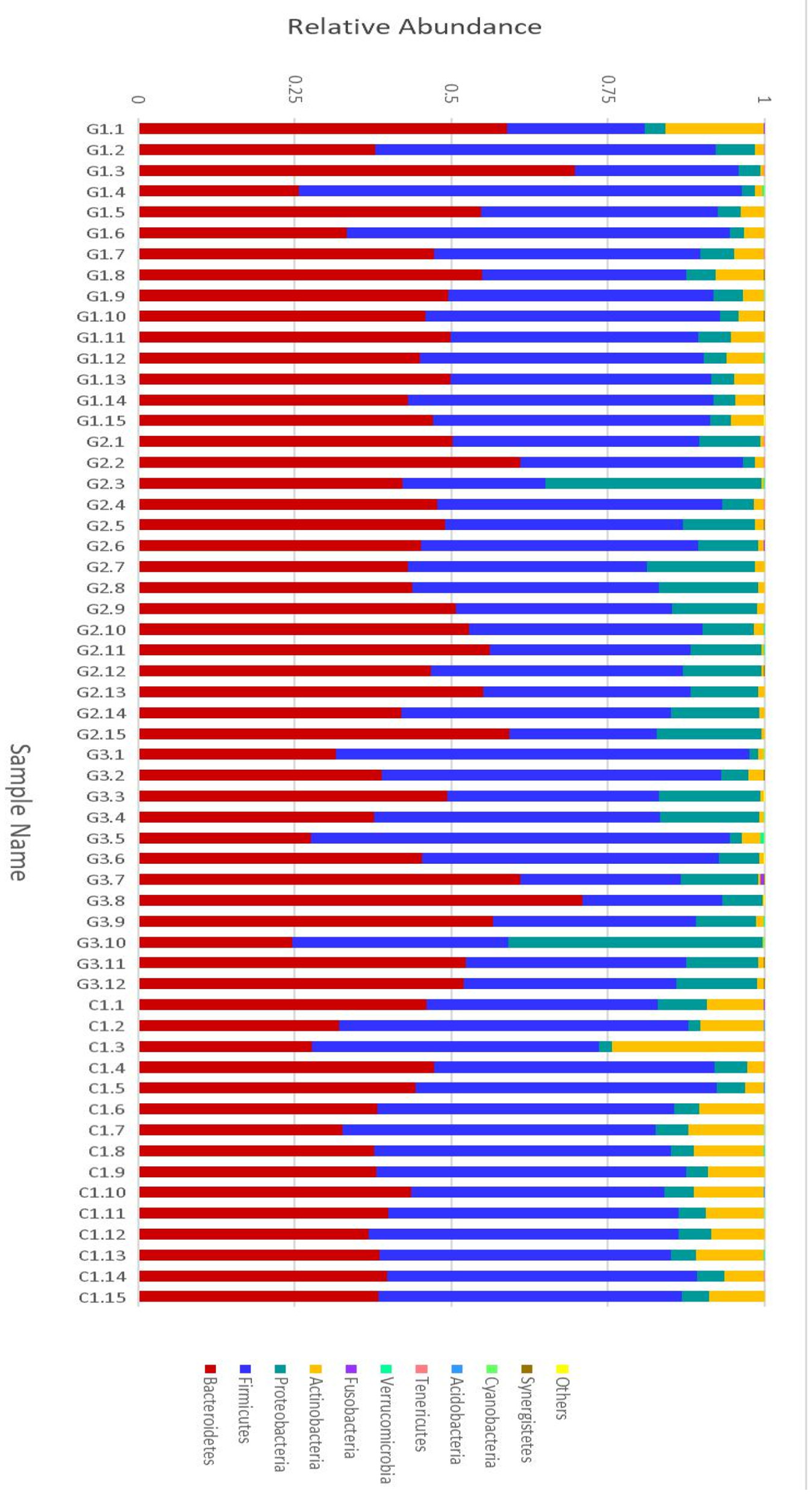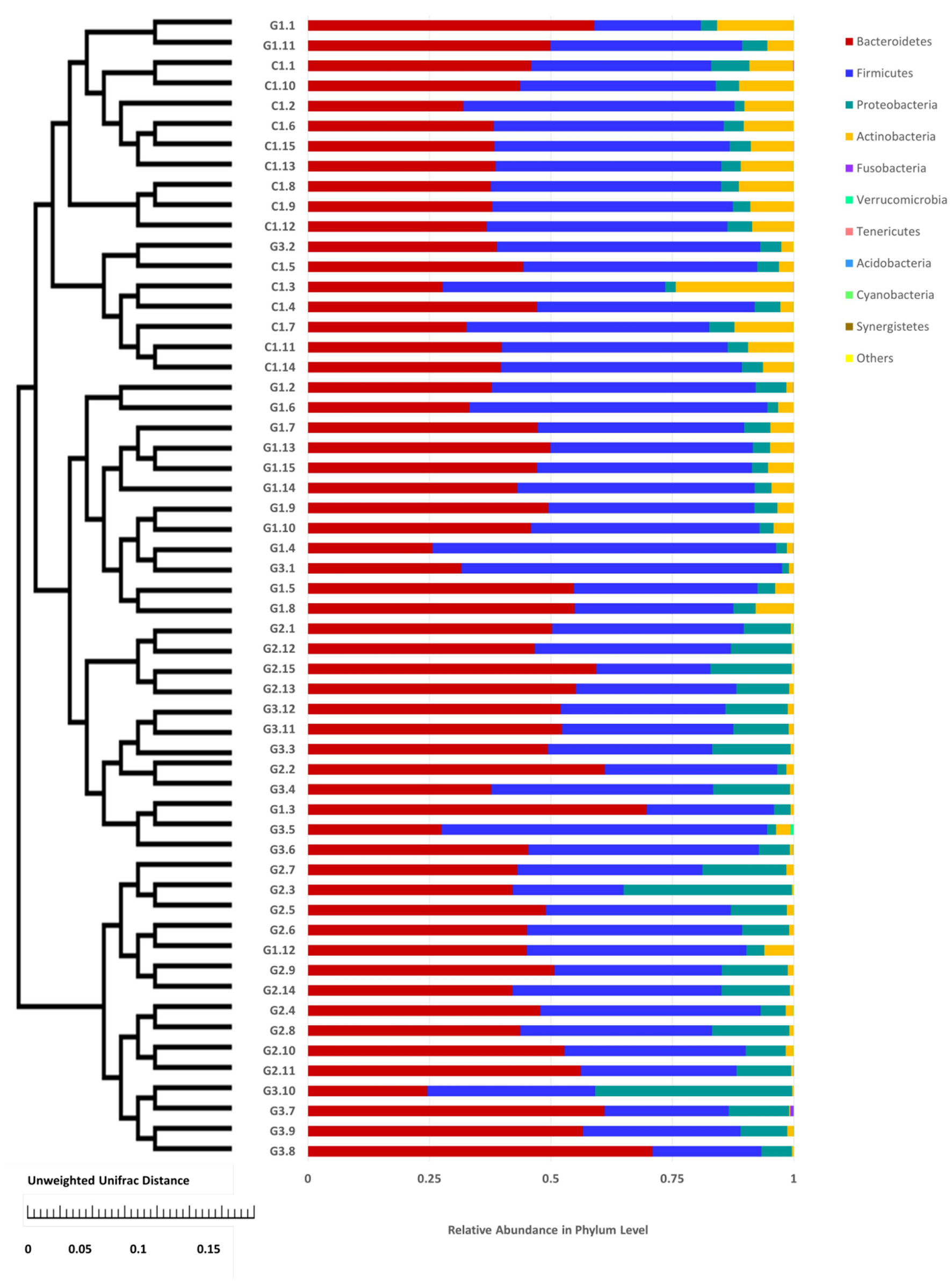 Results: The number of species composition sequences in the G1, G2 and G3 groups was lower than that in the C group, especially for the G2 and G3 groups. The four most abundant bacteria were Bacteroidetes, Firmicutes, Proteobacteria and Actinobacteria. The relative abundance of Proteobacteria in the G2 and G3 groups was significantly higher than that in the G1 and C groups, while the relative abundance of Actinobacteria was significantly reduced, and the relative abundance of Actinobacteria in the G1 group was lower than that in the C group. Principal component analysis of the UPGMA clustering tree and each group of samples showed that the microbial community composition of the same group of samples was similar.