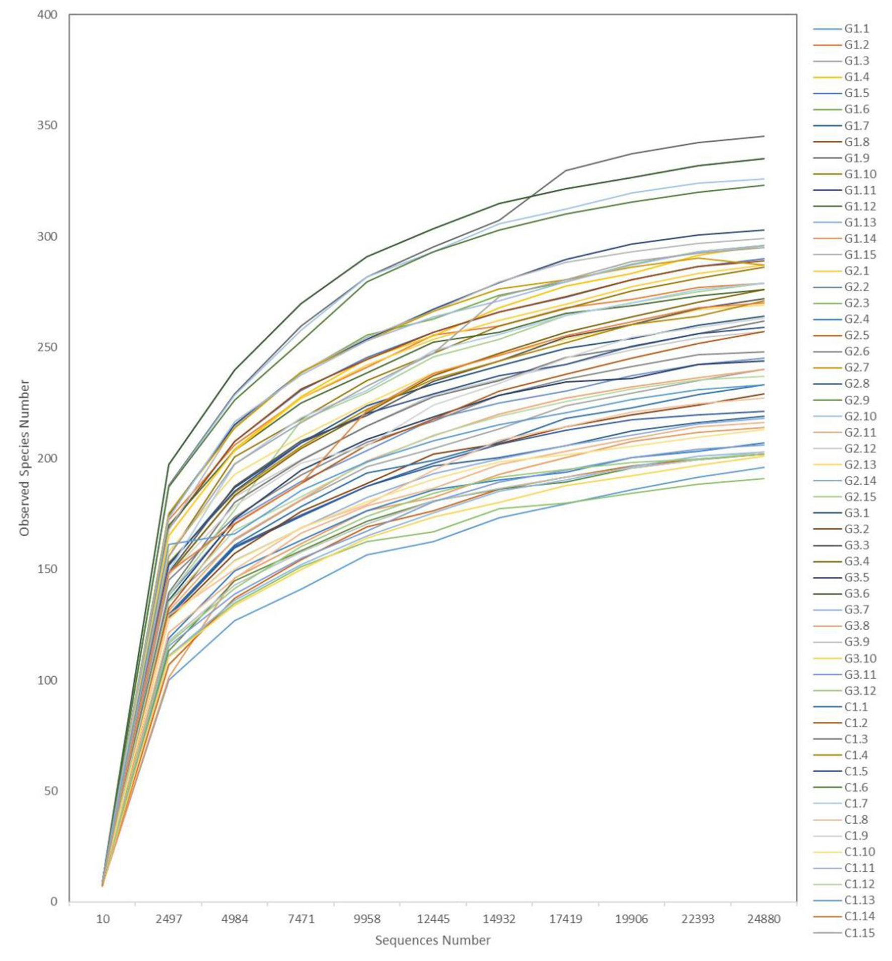Alpha Diversity is used to analyze community diversity within a sample and includes three indicators: dilution curve, species richness, and community diversity. The sample complexity index was calculated and plotted using Qiime software (Version 1.7.0). The Rarefaction Curve is used to indicate whether the amount of sequencing data of the sample is reasonable and indirectly reflects the richness of the substance in the sample. It is a curve obtained by randomly extracting a certain amount of sequencing data from a sample to calculate the number of species they represent, based on the number of species and the amount of data. In the dilution curve, when the curve tends to be flat, it means that more data will only produce a small amount of new OTU, indicating that the amount of sequencing data is reasonable.