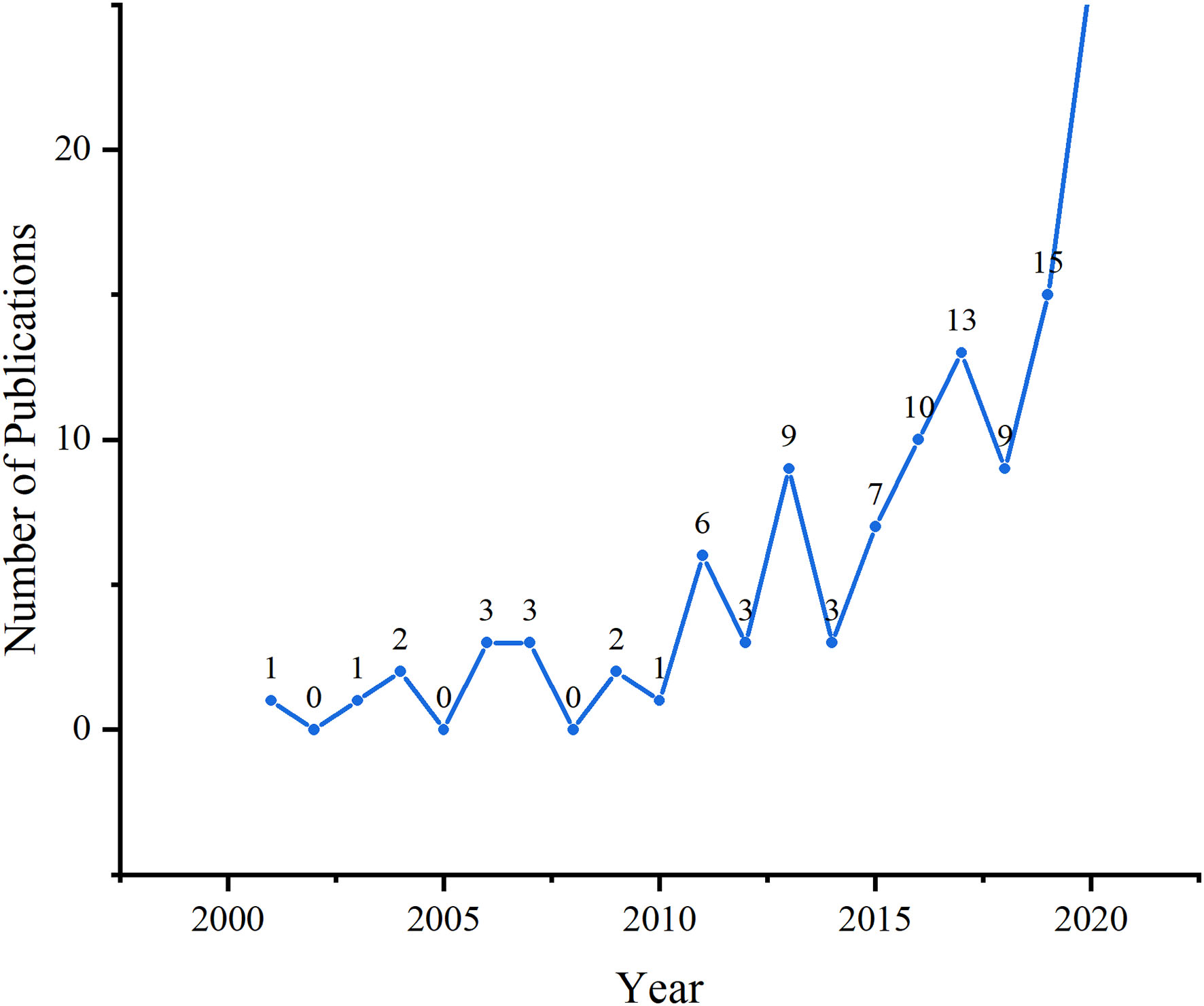 Growth trend of annual publications from 2001 to 2020.