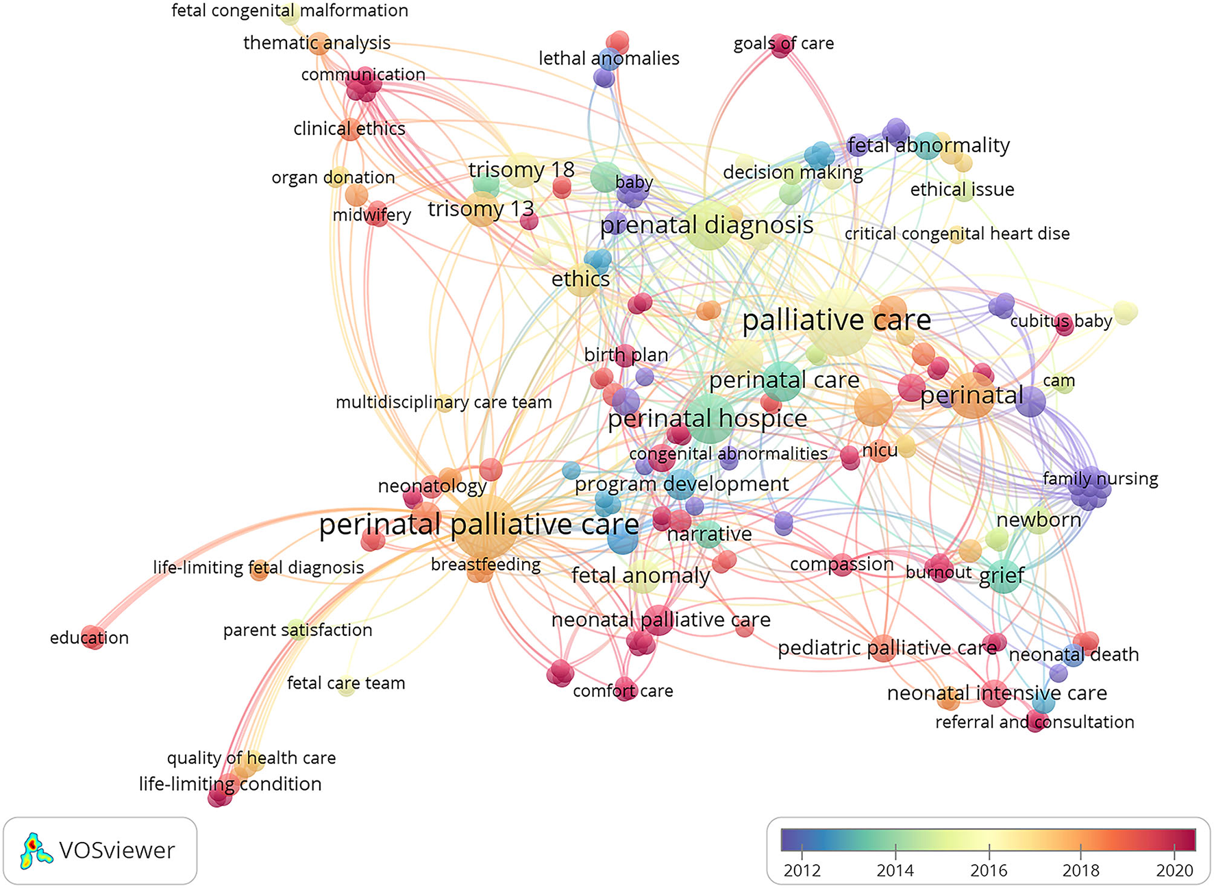The Web of Science Core Collection database was searched to retrieve publications focusing on perinatal palliative care published between 2001 and 2020. All retrieved publications were identified by title and abstract for their relevance to perinatal palliative care. These eligible publications were extracted from the following data: title, abstract, year, keywords, author, organization, journal and cited literature. VOSviewer software was used to conduct bibliographic coupling, coauthorship, and cooccurrence analyses and to detect publication trends in perinatal palliative care research.