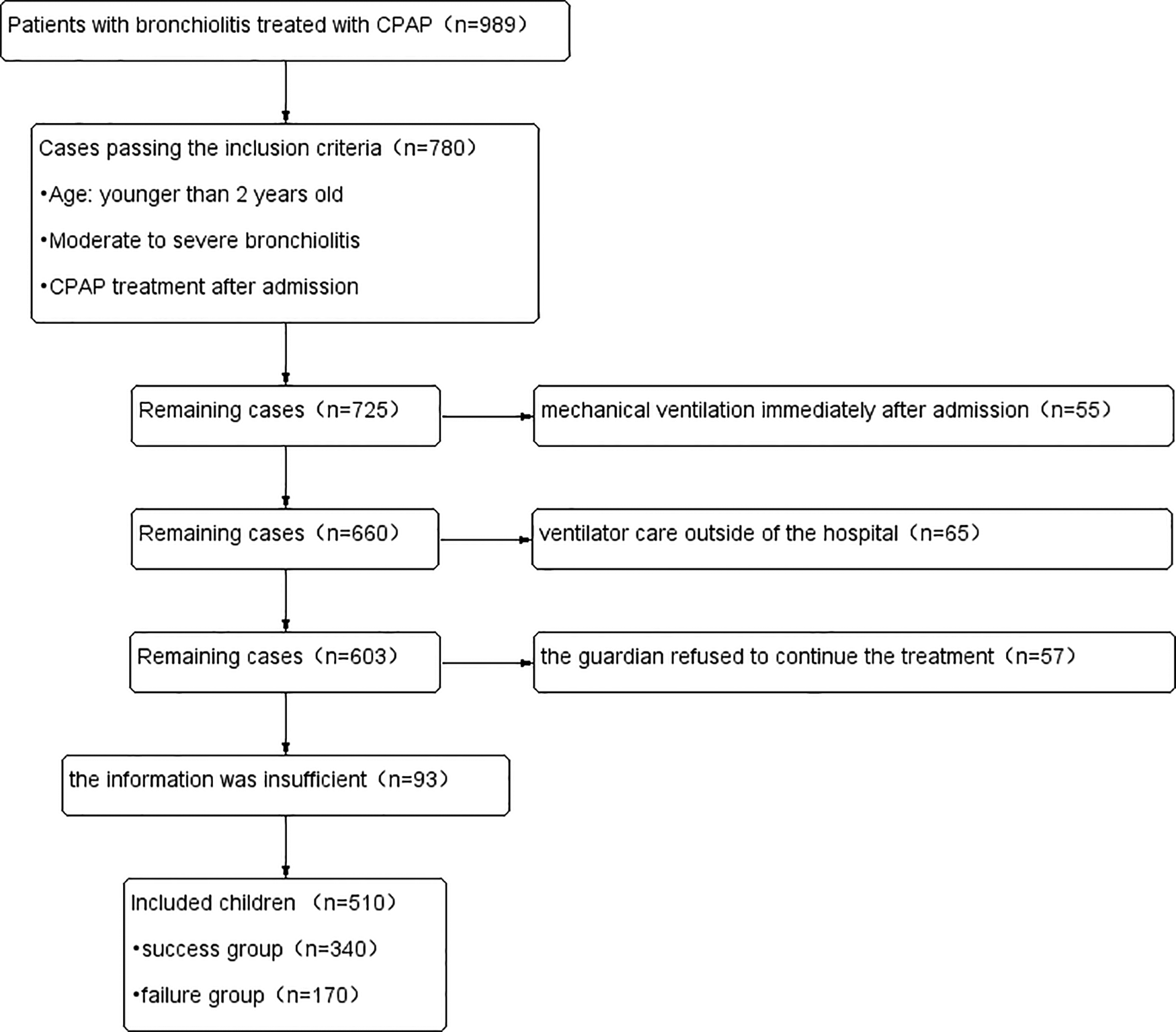 The sample size was determined using the PASS15.0 application. Normally distributed continuous data were compared by independent samples t-test and were expressed as mean ± standard deviation (M ± SD). Nonnormally distributed continuous data were compared using the Mann-Whitney U test and expressed as median (upper and lower quartiles) [P50(P25-P75)]. Categorical data were analyzed by the χ2 test or Fisher's exact test and were presented as numbers (n) and percentages (%). The factors influencing the efficacy of CPAP on children with bronchiolitis were investigated using logistic regression analysis. When p-value < 0.05, the difference was statistically significant. The prediction value of three scoring systems was assessed using the receiver operating characteristic (ROC) curve.