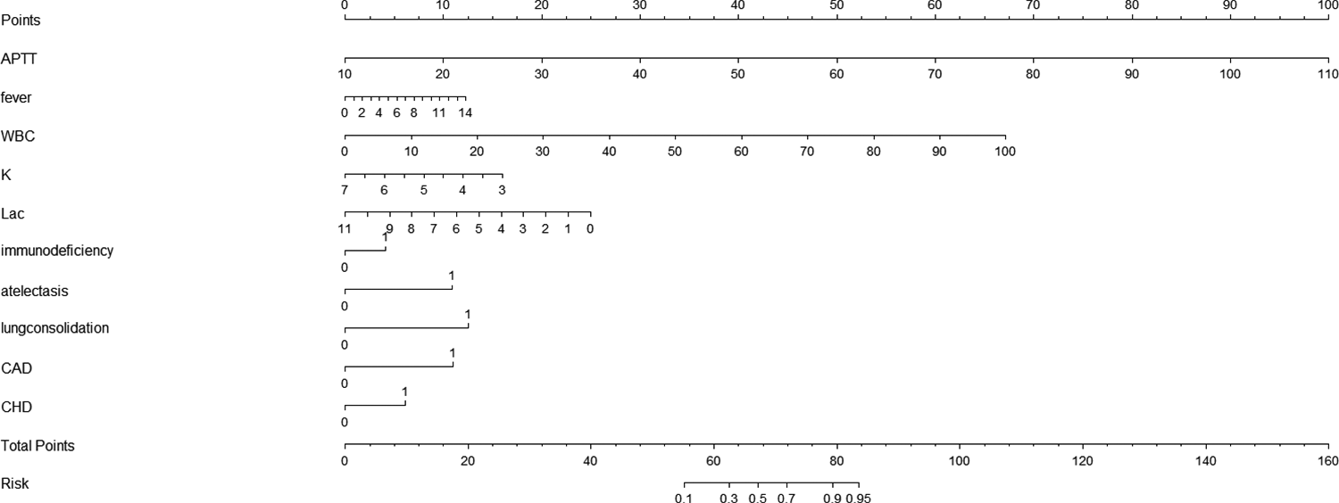 In univariate and multivariate logistic regression analysis, fever, APTT, WBC, serum potassium concentration, Lac, immunodeficiency, atelectasis, lung consolidation, CAD, congenital heart disease (CHD), PRISM III, PCIS, and PEWS were the influencing factors of the efficacy of CPAP on bronchiolitis (Tables 2, 3).