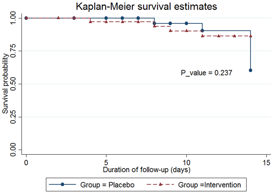 The mean length of ICU stay in the probiotics group was 14.42 ± 9.43 days, compared to 15.88 ± 14.72 days in the placebo group (p = 0.896); however, this difference was not statistically significant. The mean duration of hospitalization in the probiotics group was 26.46 ± 20.62 days, compared to 31.96 ± 22.46 days in the placebo group (p = 0.290). The mean ventilation duration in the probiotics group was 218.57 ± 152.77 h, compared to 268.82 ± 175.68 h in the placebo group (p = 0.238). The occurrence of 14-day mortality and the probability of survival was not statistically significant in the placebo group compared to the probiotic group (20.59% vs. 10.53% p = 0.641) (Table 3, Figure 2).
