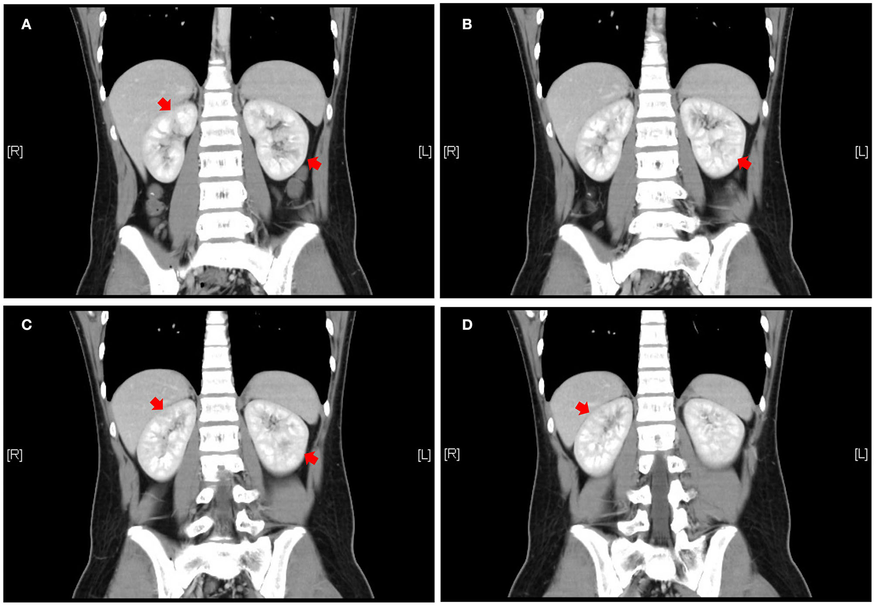 Abdominal enhanced CT coronal view, front to rear, numbered A to D. Patchy and slightly less enhanced areas are seen in both kidneys (red arrows). CT = computed tomography to illustrate the meaning of A–D.