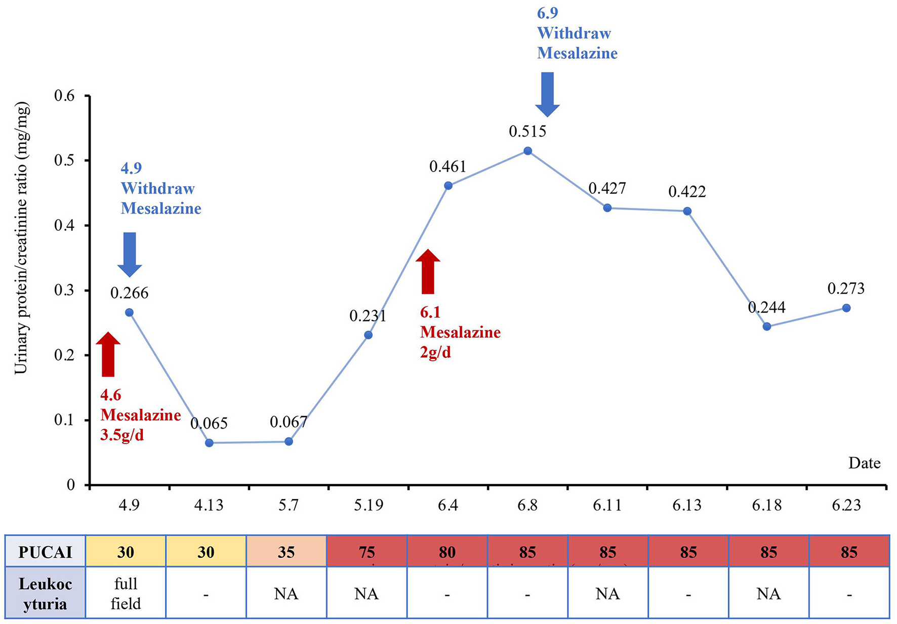 Three days later, urinalysis of the first-morning urine showed no leukocyturia and urinary protein returned to normal (95 mg/L), and the P/C ratio decreased to 0.065 mg/mg. Serum creatinine was 0.38 mg/dl and cystatin C was 0.65 mg/L. However, the patient's UC symptoms began to worsen gradually. Infliximab combined with tacrolimus or cyclosporine was used to control UC, but the therapeutic efficacy was not satisfactory. Urinalysis of the first-morning urine was performed during the medication period, without leukocyturia or proteinuria. The P/C ratio fluctuated between 0.065–0.067 mg/mg, and the serum creatinine was 0.37 mg/ dL. The patient was forced to discontinue the immunotherapy due to the drug-related side effects, such as severe vomiting. The urinalysis of the first-morning urine was normal several times, and mesalazine was administered again considering the kidney injury had subsided. While kidney injury reappeared 1 week later as evidenced by proteinuria. Urinary protein was increased to 1,401 mg/L and the P/C ratio was 0.52 mg/mg. Urine culture was still negative for aerobic and anaerobic bacteria. The urinalysis of the first-morning urine returned to normal 2 weeks after mesalazine withdrawal, but the PUCAI score remained at 85 (Figure 2).