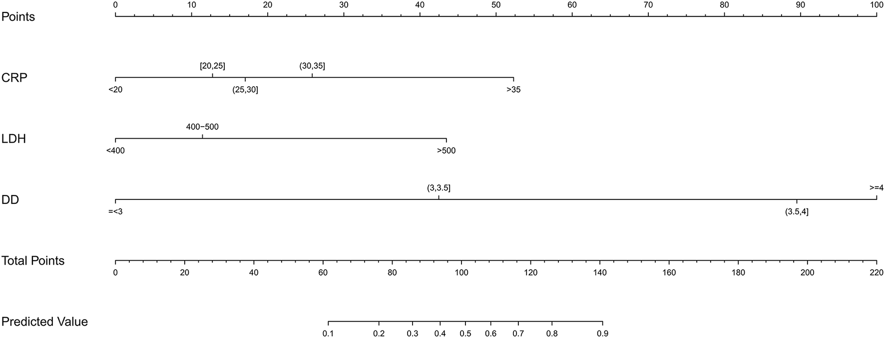 The clinical variables associated with RMPP were assessed based on clinical importance and predictors identified in previously published articles, and the indexes with statistically significant differences were selected from Tables 1–3 as the included variables as well. Stepwise regression (forward, backward, back-and-forth selection) was used for variable selection. The variables corresponding to the smallest AIC value were selected. Finally, CRP [OR = 1.075 (95% CI: 1.020–1.133), P < 0.001], LDH [OR = 1.015 (95% CI: 1.010–1.020), P < 0.001], and D-dimer [OR = 70.94 (95% CI: 23.861–210.904), P < 0.001] were selected as three predictive factors for RMPP (Table 4).